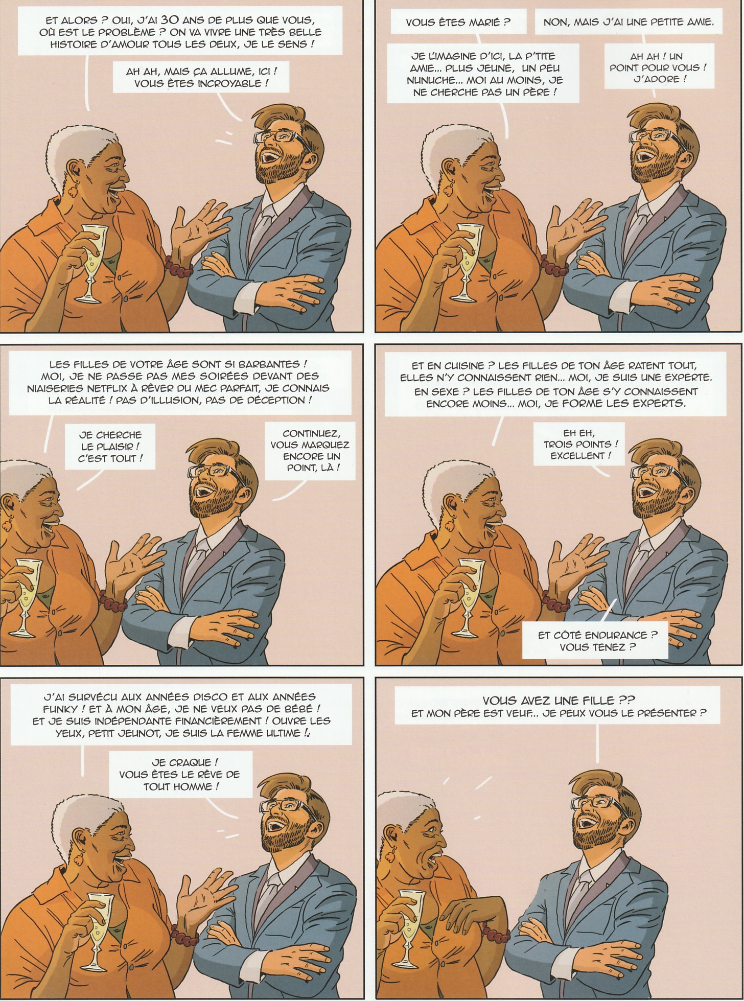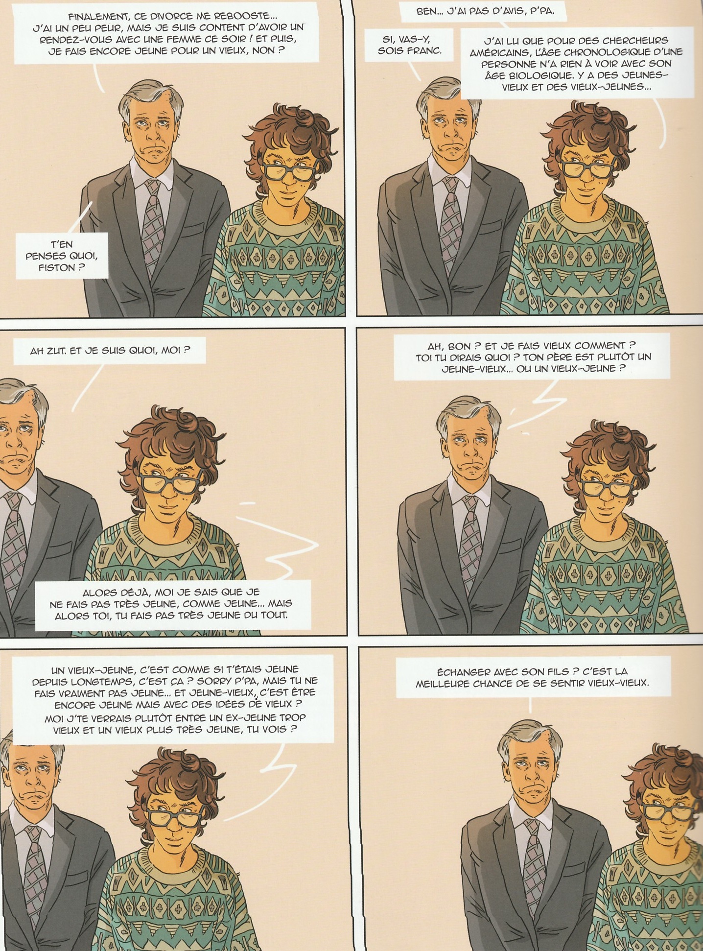Des histoires et anecdotes comme celles-ci, 60 ans, déjà ? en regroupe à la pelle. Après avoir rhabillé pour la semaine les masculinistes toxiques et féministes extrémistes de tout poil avec son Chant du cygne, Jim se rappelle qu’il bascule d’une dizaine et revisite la lutte des générations avec ce nouvel album. L’artiste aux multiples casquettes reprend d’ailleurs la même construction. Le lecteur se retrouve donc face à des gaufriers de deux par trois avec la même image répétée. Une nouvelle fois, il va y avoir quelques modifications : rétrécissement et/ou élargissement de champ, personnage qui apparaît ou/et disparait mais les unités théâtrales sont bien présentes. Cela a pour mérite de fixer le cadre et d’exposer des personnages dans un laps de temps minuscule. On s’amuse également à jouer au jeu des différences entre les vignettes car on comprend vite que ces petites nuances ont un rôle primordial dans les chutes de chaque gag. Pour faire simple, c’est dynamique, drôle (surtout pour ceux qui n’ont pas encore atteint l’âge fatidique) et terriblement corrosif. C’est l’œuvre des dialogues qui, sous de faux airs inoffensifs, sont d’une ironie irrésistible. Pas besoin d’aller très loin, le premier gag donne le ton : pour obtenir une réduction, un sexagénaire préférerait la carte jeune à la carte senior mais, refusant son âge, il paiera plein tarif, qualifiant au passage le jeune guichetier de nom d’oiseau ! C’est décalé à souhait mais pourtant tellement réaliste et en fin de compte… vrai. Néanmoins, l’humour tout cruellement juste ne devient jamais méchant. On se moque des travers et des rêves inaccessibles remis au lendemain mais tout le monde en prend pour son grade et le fond reste bon enfant. Ces féroces gag et géniaux traits d’esprit sont mis en couleur dans des teintes extrêmement fraîches signées Delphine. Un travail familial qui renforce l’aspect joyeux de la soixantaine.