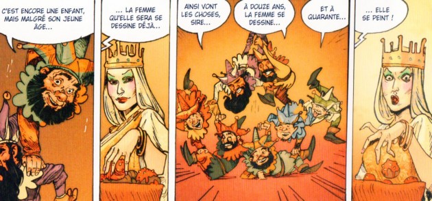 Le scénario est confié à Wilfrid Lupano. Comme à son habitude, il nous livre une histoire pleine d’humour mais qui pique un peu aux entournures ! On retrouve la satire sociale, déjà présente dans L’assassin qu’elle mérite ou Célestin Gobe la lune mais aussi l’opposition intergénérationnelle des Vieux Fourneaux. Ce mélange vient dynamiter le conte des frères Grimm, pour notre plus grand plaisir ! Surtout qu’à cette version au vitriol, Lupano rajoute des dialogues dignes d’un Michel Audiard : « au château, tout le monde me pelotait […] et ici, des poneys en rut avec des morceaux de barbaque plein les dents ».