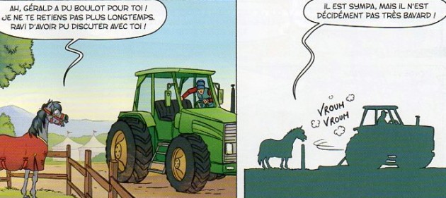 embringués dans un concours « at’hippique » des plus rock and roll ! Au programme : séance de brossage, préparation du parcours d’obstacle ou nouvelles techniques de sauts. Mais attention, à chaque page son gag ! Et tout le monde en prend pour son grade, pour le plus grand plaisir des chevaux… et des lecteurs ! Comment ne pas sourire de la jalousie de Balou lorsque le champion vient compter fleurette à Bella ! Comment ne pas voir une critique de la mode loufoque lorsque Bijou et Viking se moquent, hilares, de l’accoutrement de leurs congénères ! Il faut dire que ces équidés ont une sacrée liberté de ton lorsqu’ils se demandent pourquoi les humains tiennent leurs chiens, pourtant sages, en laisse mais laissent courir en toute liberté, leurs garnements d’enfants !