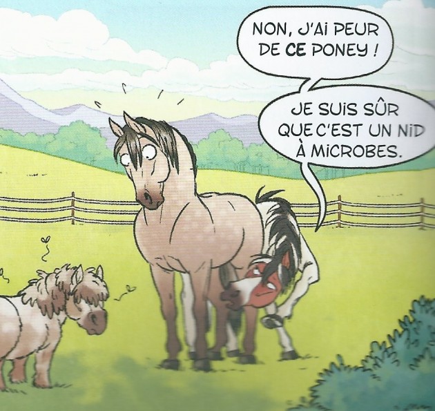 Delcourt l’avait annoncé, les auteurs sont particulièrement bien renseignés sur le sujet, et, Laurent Dufreney et Miss Princkly traitent avec légèreté le sujet en donnant la parole aux chevaux qui sont les vrais protagonistes de l’histoire. Ces derniers posent d’ailleurs à maintes reprises leur regard sur la vie des drôles de bipèdes qui parsèment leur quotidien, en allant jusqu’à imaginer leur quotidien.