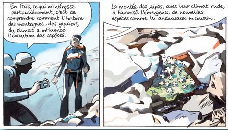 Au dessin, Cécile Guillard, que j’avais découvert (et apprécié) avec Refuge, confirme son immense talent pour croquer les grands espaces. Son trait est lumineux et parvient à rendre la montagne à la fois imposante et accueillante. Les planches consacrées aux plantes sont d'une précision délicate, tandis que les scènes d'escalade sont vraiment magnifiques ! Son travail sur les couleurs est également très chouette notamment avec son jeu sur les contrastes entre la rudesse minérale et les fragiles fleurs (parfois aussi vieilles que colorées).