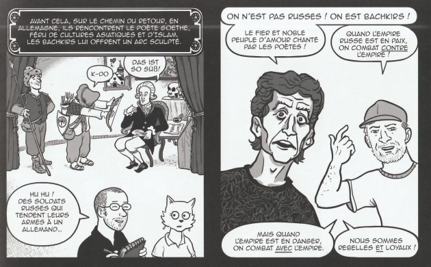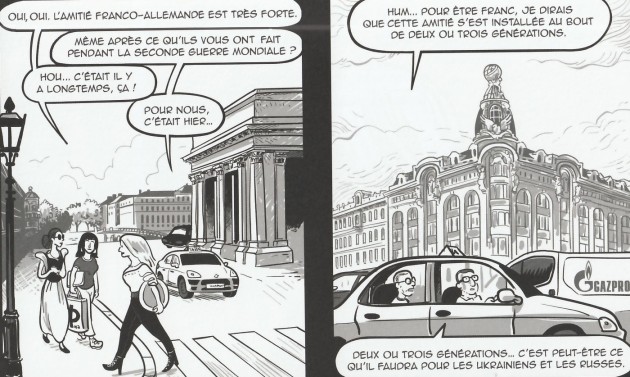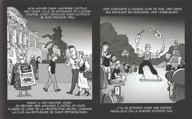 sert alors de dangereux extrémistes fanatiques de la culture slave ou, à contrario, de gentils démocrates. Malheureusement, la réalité est loin d'être aussi manichéenne ! A travers cet album reportage, Nicolas Wild nous raconte ces quelques semaines durant lesquelles il a écouté les habitants de Saint-Pétersbourg mais s'est aussi baladé des provinces plus rurales et agricoles.Sous l'égide de Chat, il a rencontré un opposant politique qui lui explique comment le système perturbe le jeu démocratique, des nostalgiques de l'URSS qui confondent domination et amitié, ouverture d'esprit et décadence mais aussi de farouches opposantes. Mais il nous raconte également l'attachement à des valeurs qu'on peut estimer décaties et une perte de valeurs qu'on jugerait essentielles. À travers ce format à l'italienne, assez rare de nos jours, le récit prend un air de cinéma. Les rencontres se font sur écran 16/9 donnant l'impression d'une seule et unique bande. Le choix du noir et blanc est aussi original que judicieux. Il n'y a plus de couleurs, vives ou sombres, plus de lumière ou d'obscurité. C'est totalement surprenant après une couverture aux teintes tricolores