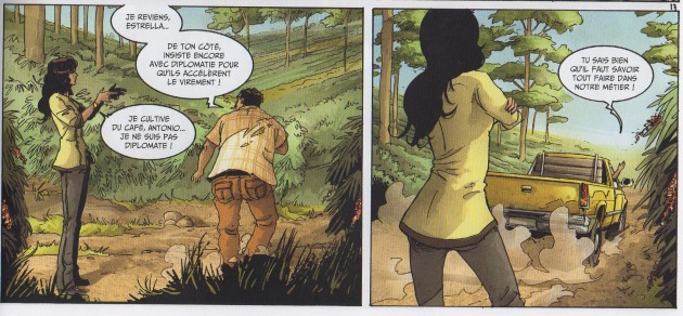 Cet album ouvre ainsi de nouvelles perspectives pour le scénariste. Le café est produit sur de nombreux continents, c’est un produit d’enjeu économique, sociale, politique. De quoi faire voyager Albane et la placer au cœur d’intrigue sensible.