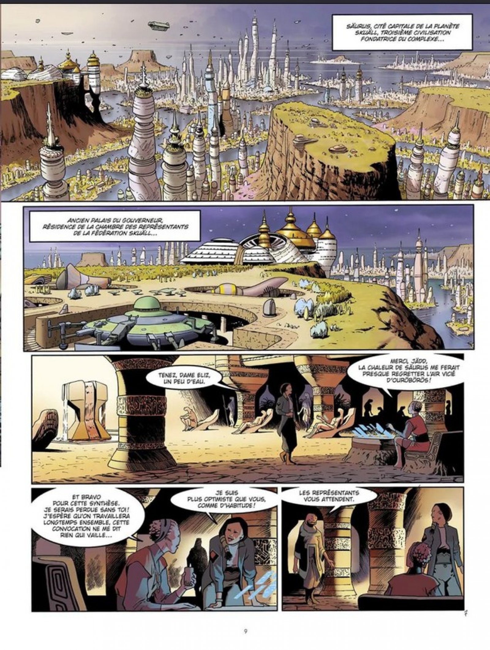 Le dessin d’EMEM soutient efficacement cette ambition. Les environnements de Nacara, massifs et industriels, dégagent une impression d’écrasement permanent. La mise en scène privilégie la lisibilité, même dans les séquences de bataille, tandis que les cadrages soulignent la petitesse des personnages face aux machines, aux flottes et aux architectures monumentales.