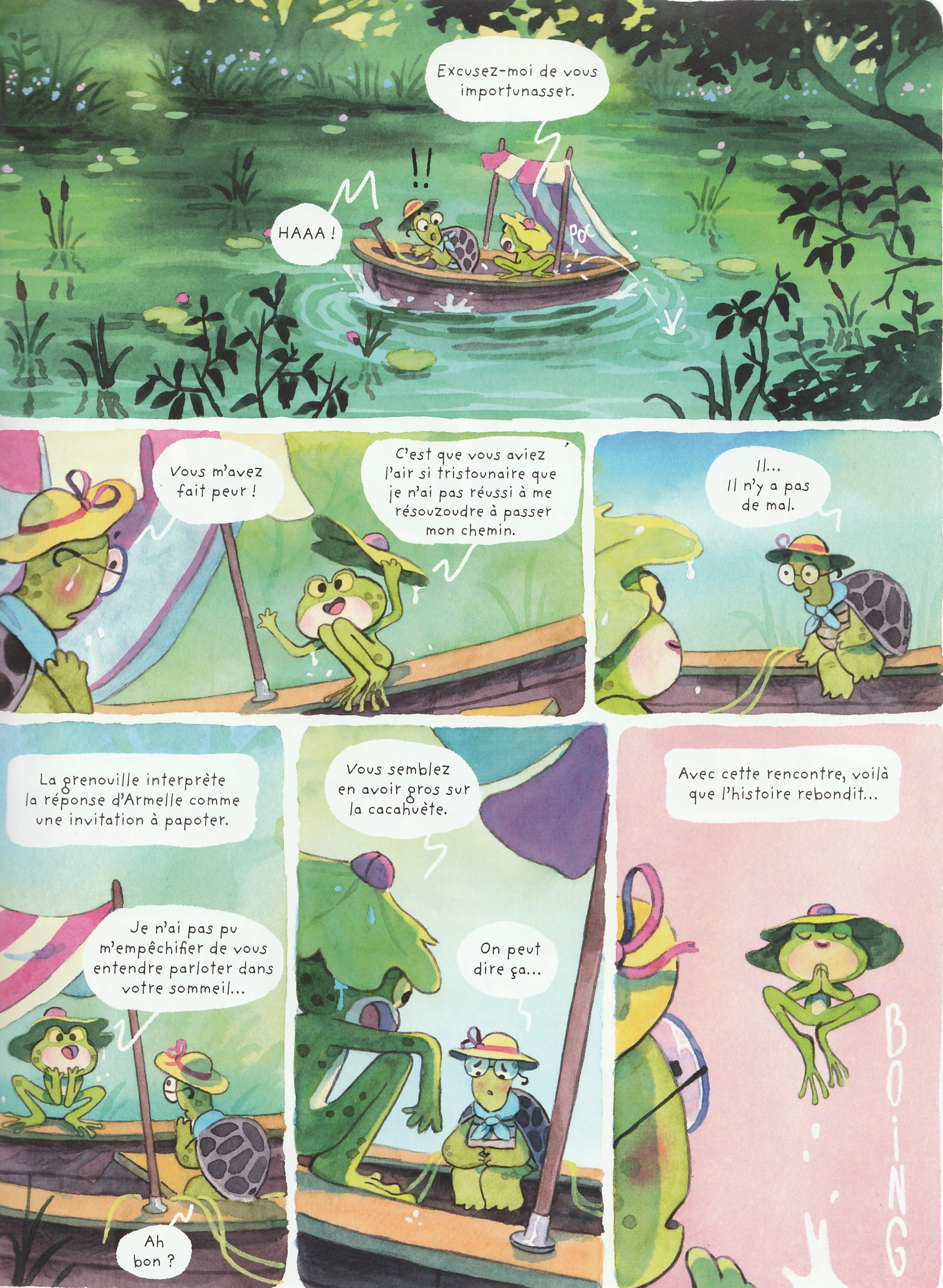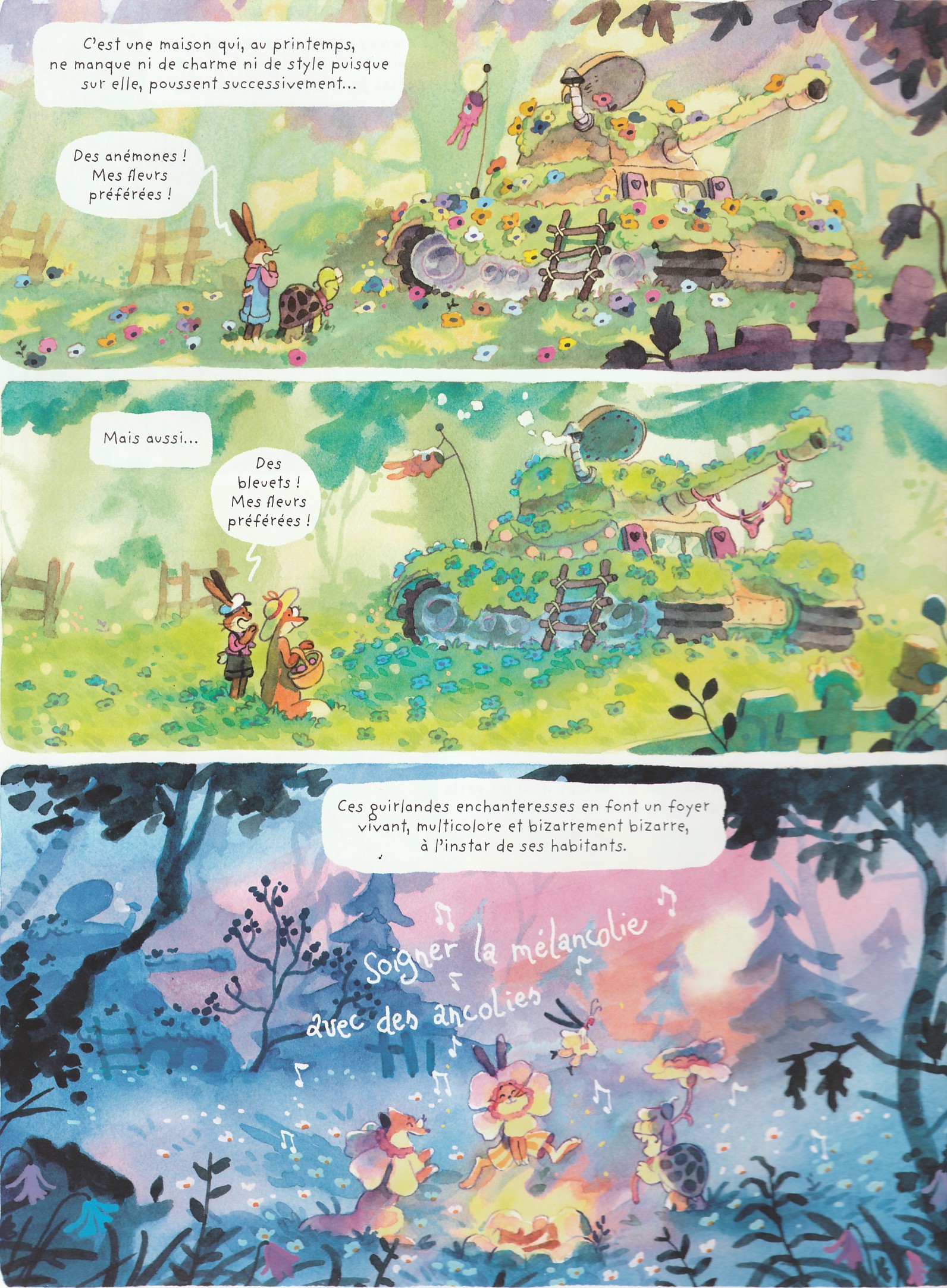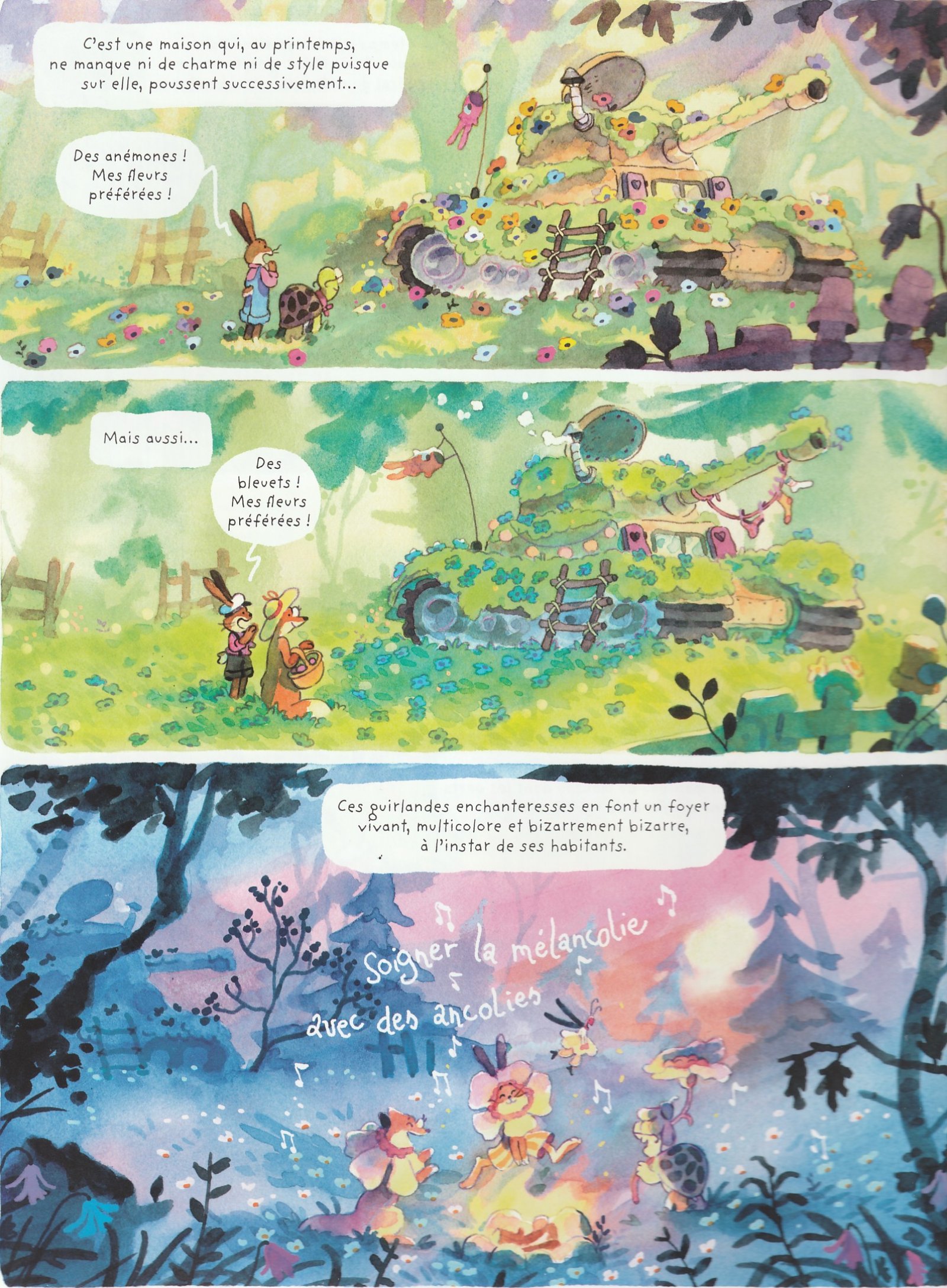 Comment évoquer le concept de charge mentale auprès des plus jeunes ? Comment dire à ses proches, même si on les aime plus fort que tout, que leurs manies et leurs petits défauts nous tapent sur le système ? Voilà en substance l’intrigue de cette nouvelle aventure, d’Armelle et Mirko. Un petit retour en arrière s’impose. D’aussi loin qu’elle se souvienne, Armelle, la petite tortue, a été effrayée par le noir. Sa rencontre avec la petite luciole Mirko a été une révélation. Tout doucement, le duo est devenu quatuor avec l’arrivée de la renarde Fabienne et du lapin Pépin. Ensemble, ils ont affronté des tempêtes et des inondations qui ont ravagé leur maison. Mais ça y est ! le printemps est revenu et avec lui les jours heureux. Pourtant, Armelle déprime. Elle est de plus en plus fatiguée. Bien sûr elle aime la musique de Mirko, mais pas le matin au réveil. Évidemment, elle aime la cuisine de Fabienne, mais elle pourrait être un peu moins riche. Assurément, elle s’émerveille face aux trouvailles de Pépin, mais s’il pouvait mieux les ranger. En un mot, Armelle a l’impression de devenir la mère de ses amis. Malheureusement, elle n’ose rien leur dire de peur de perdre cette amitié si précieuse à ses yeux. Tout doucement, Armelle va sombrer et, à bout de force, elle va s’enfuir. C’est alors qu’elle va rencontrer une grenouille qui va lui ouvrir les yeux. La seule solution, c’est le dialogue. Même si cela peut faire peur, si ses amis l’aiment autant qu’elle les aime, ils comprendront. Si vous remplacez Armelle par les parents et ses amis par des enfants, vous obtenez une explication pleine de douceur et vos enfants vont donc se faire une joie de ranger leur chambre et d’essuyer la vaisselle. Il ne faudrait pourtant pas oublier que cette série jeunesse est bourrée de poésie. La maison se trouve dans un char recouvert de fleurs et elle regorge d’objets tous plus merveilleux que les autres. Tout cela, c’est l’œuvre de Loïc Clément. Le dessinateur nous prouve une nouvelle fois qu’on peut réaliser une œuvre jeunesse sans tomber dans l’infantilisme. C’est extrêmement beau, particulièrement coloré et lumineux, mais jamais niais : la colère et le désespoir de la petite tortue étant parfaitement montrés. Pour autant, la variété des cases et des angles de vue, ainsi que les sublimes couleurs de Julien Arnal apportent un plaisir de lecture intense. On s’émerveille devant la douceur du narratif et on s’immerge totalement dans l’intrigue.