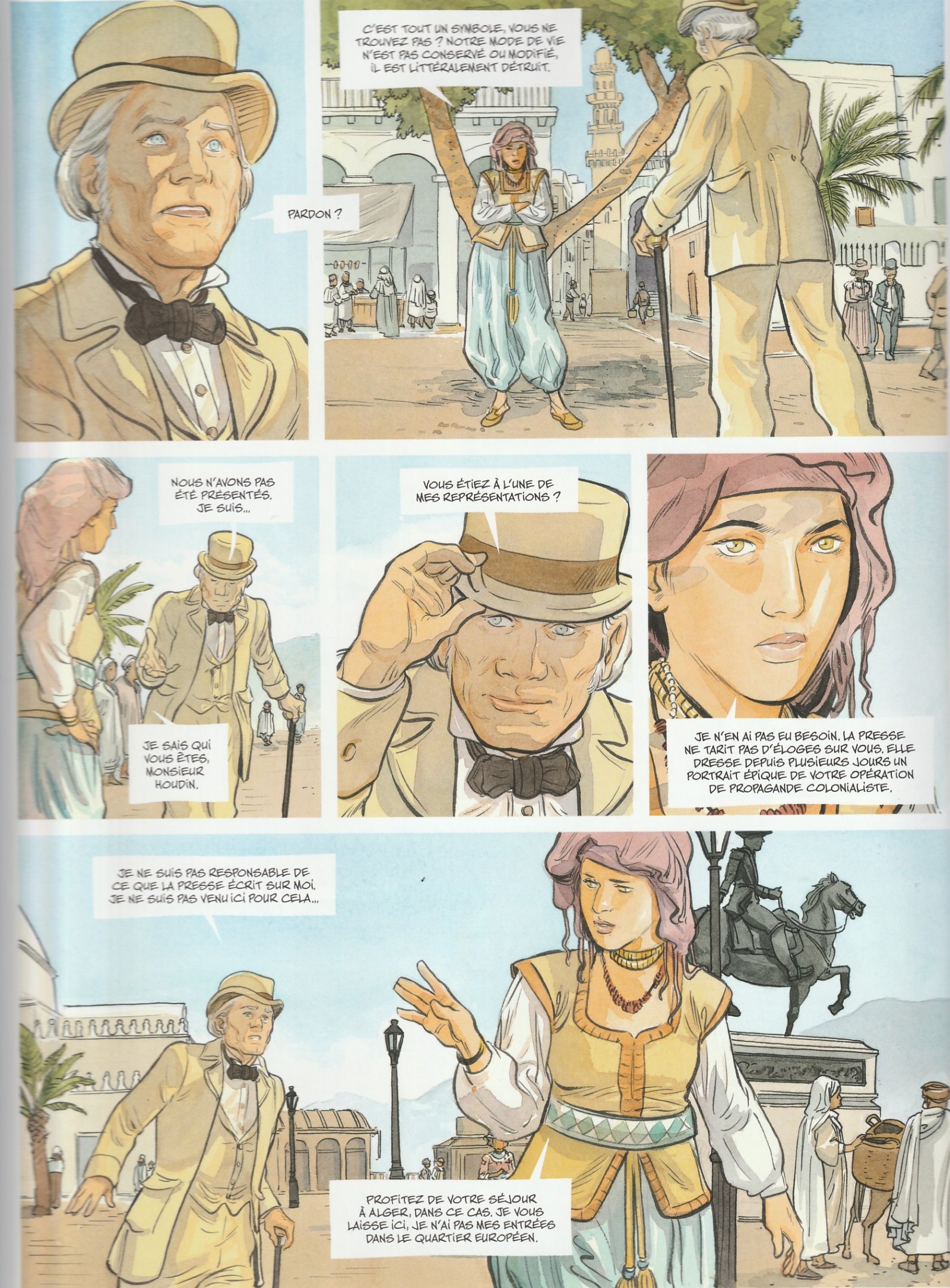 Il est des personnages historiques, la même chose que des héros de papier. Certains s’impriment profondément dans les mémoires. C’est incontestablement le cas de Jean-Eugène Robert-Houdin ! Quiconque a, une fois dans sa vie, visité la ville de Blois n’a pas pu ne pas remarquer son magnifique château, en face du palais Royal (excusez du peu !) et fait l’économie d’une visite dans la magnifique collection qui lui est consacrée. L’homme passe pour être le plus grand prestidigitateur de France, le David Copperfield Hexagonal. Pourtant, il cache de nombreuses zones d’ombre. Bien sûr, il y a sa retraite anticipée mais c’est plutôt son rôle dans la colonisation de l’Algérie qui intéresse Mathieu Mariolle. En effet, le magicien sortit de sa retraite en 1956 pour donner une série de spectacles à Alger. L’objectif était clairement politique : démontrer aux Algériens que les tours de leurs marabouts n’étaient que supercheries et poudre aux yeux. Tout cela, et bien plus encore, est profondément raconté et illustré dans les dix pages du cahier supplémentaire situé en fin d’album. Mais revenons à notre intrigue. Le scénariste imagine que Robert-Houdin accepte de prendre la route pour le Sahara. En chemin, il fait la rencontre de la belle Nélia. L’histoire qu’elle lui raconte, alors qu’il est son prisonnier, le bouleverse et il voit en elle les fantômes de sa fille. Précisons ici que le magicien n’a eu que des garçons. Il va donc se retrouver dans une situation cornélienne : éviter les bains de sangs ou protéger la jeune femme. C’est ce cheminement intérieur, avec ses doutes et ses errances, autant que les pérégrinations bien réelles qui nous sont racontées. Cela donne un récit rythmé par les tours de passe-passe et les introspections du héros. En toile de fond, il y a la violence de la colonisation, mais également celle d’une Nélia tout en contradiction : lutte violente contre l’oppression coloniale, masculine et religieuse. Bien qu’ayant plus d’un siècle, toutes ces problématiques n’ont jamais été aussi contemporaines. Côté dessin, on retrouve le trait précis de l’espagnol Julien Ribas. Le style semi réaliste permet de laisser planer une touche de mystère quant à certains tours alors que d’autres sont, eux, clairement expliqués. L’élégance du trait n'a alors d’égale que celle d’Houdin. La colorisation à l’aquarelle permet de donner vie à la blancheur d’Alger tout comme au désert du Sahara, en passant par les intérieurs feutrés à l’européenne et les palais orientaux. C’est absolument magnifique !