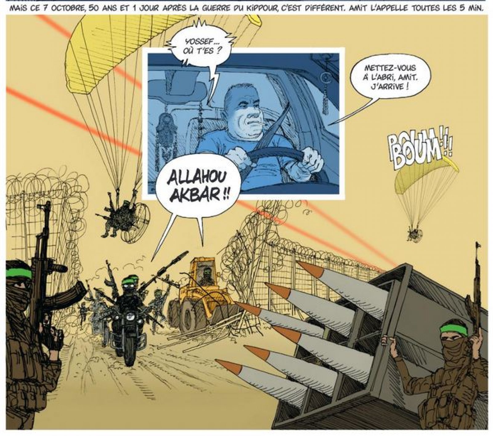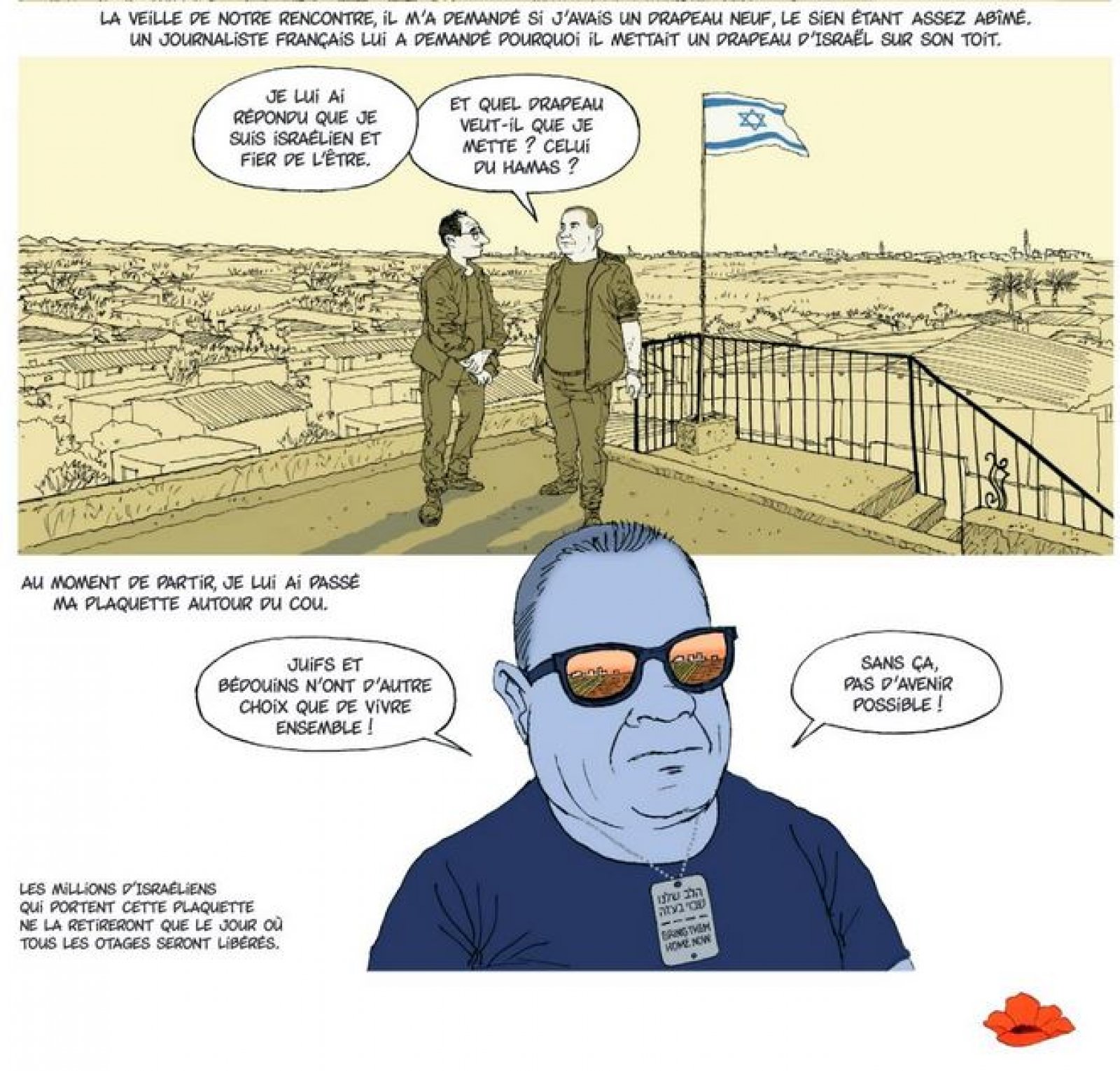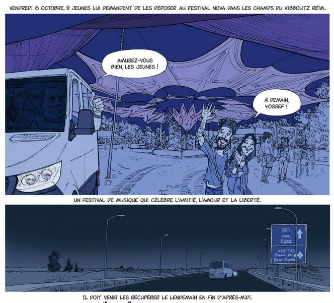 Si l’on revient à la création de cette BD, Ouri Fink, célèbre dessinateur israélien, a décidé de rendre hommage aux victimes en témoignant des horreurs mais également de la façon dont certain ont résisté ou bien encore comment des bédouins ou des palestiniens ont aidé des israéliens. On découvre ainsi l’histoire de Yossef, le taxi qui a sauvé plus de 30 jeunes en les évacuant du festival, Aner qui a tenté de sauver des festivaliers en se sacrifiant, Aya l'Israélienne et Hisham le Palestinien, qui se sont aidés (et ça donne un peu d'espoir sur l'avenir et la nature humaine), et plein d’autres encore...