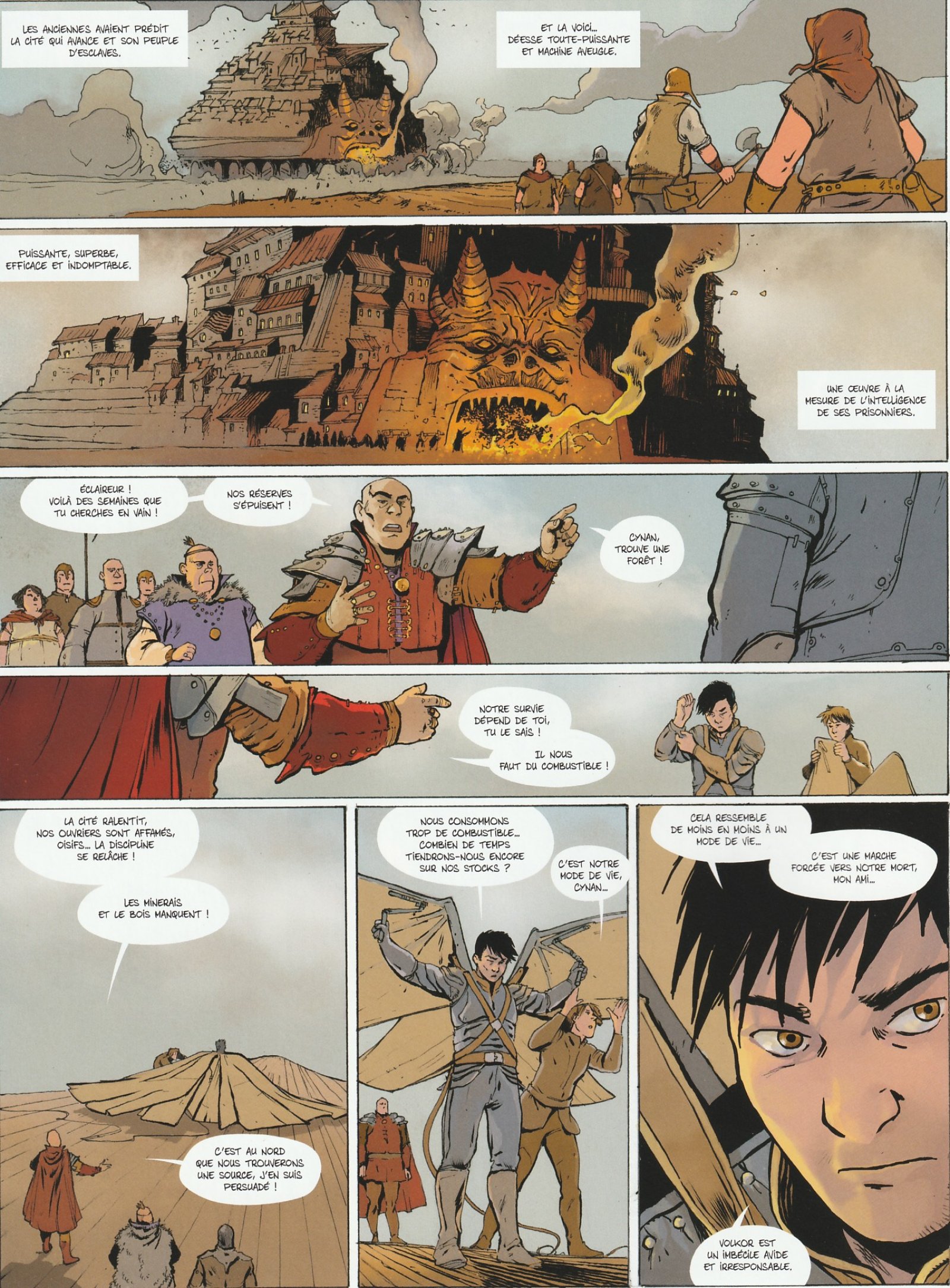 A l’origine, avant toute chose, il y avait l’Arbre. Pour le protéger, les anciennes ont confié sa sécurité à la gardienne : Automne. Ainsi se nomme-t-elle car elle est le crépuscule de son espèce. La menace vient d’une monstrueuse citée sur roue. Sous les ordres de Volkor, elle engloutit tout ce qu’elle trouve : bois, métaux et minerais précieux. Sauf qu’elle a de plus en plus de mal à trouver de nouvelles richesses. Cette quête est confiée à un éclaireur : Cynan. Grâce à ses ailes volantes, il survole les terres mais, lorsqu’il découvre la forêt d’Automne, il entend des voix et refuse de la livrer à l’avidité de Volklor. Il déserte ! C’est alors qu’il fait la rencontre d’Automne. Bien qu’intriguée, la gardienne se laisse convaincre par le plan de Cynan. Pourtant, que peuvent deux jeunes face à la voracité de la cité ? Réussiront-ils à empêcher la catastrophe annoncée ?