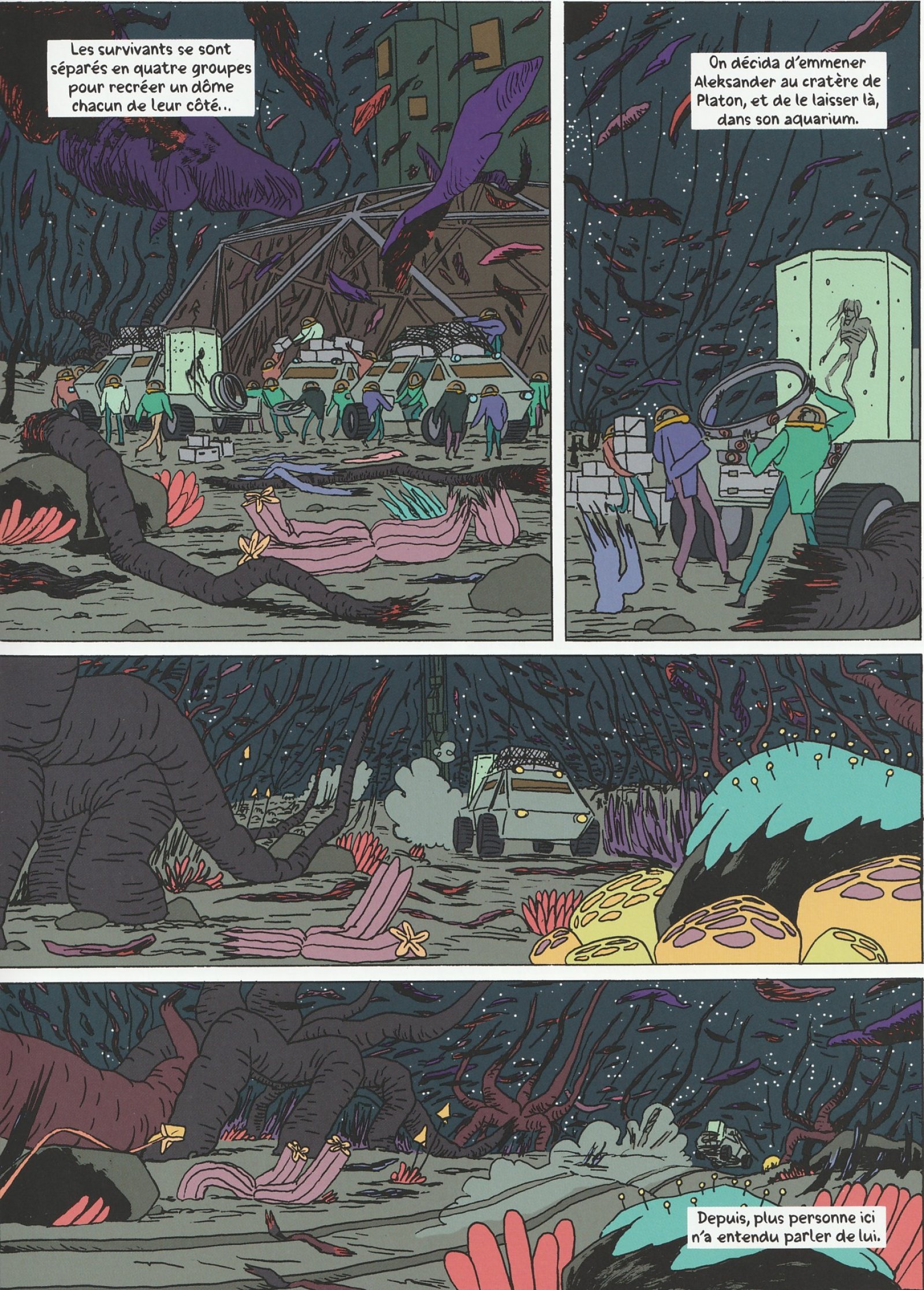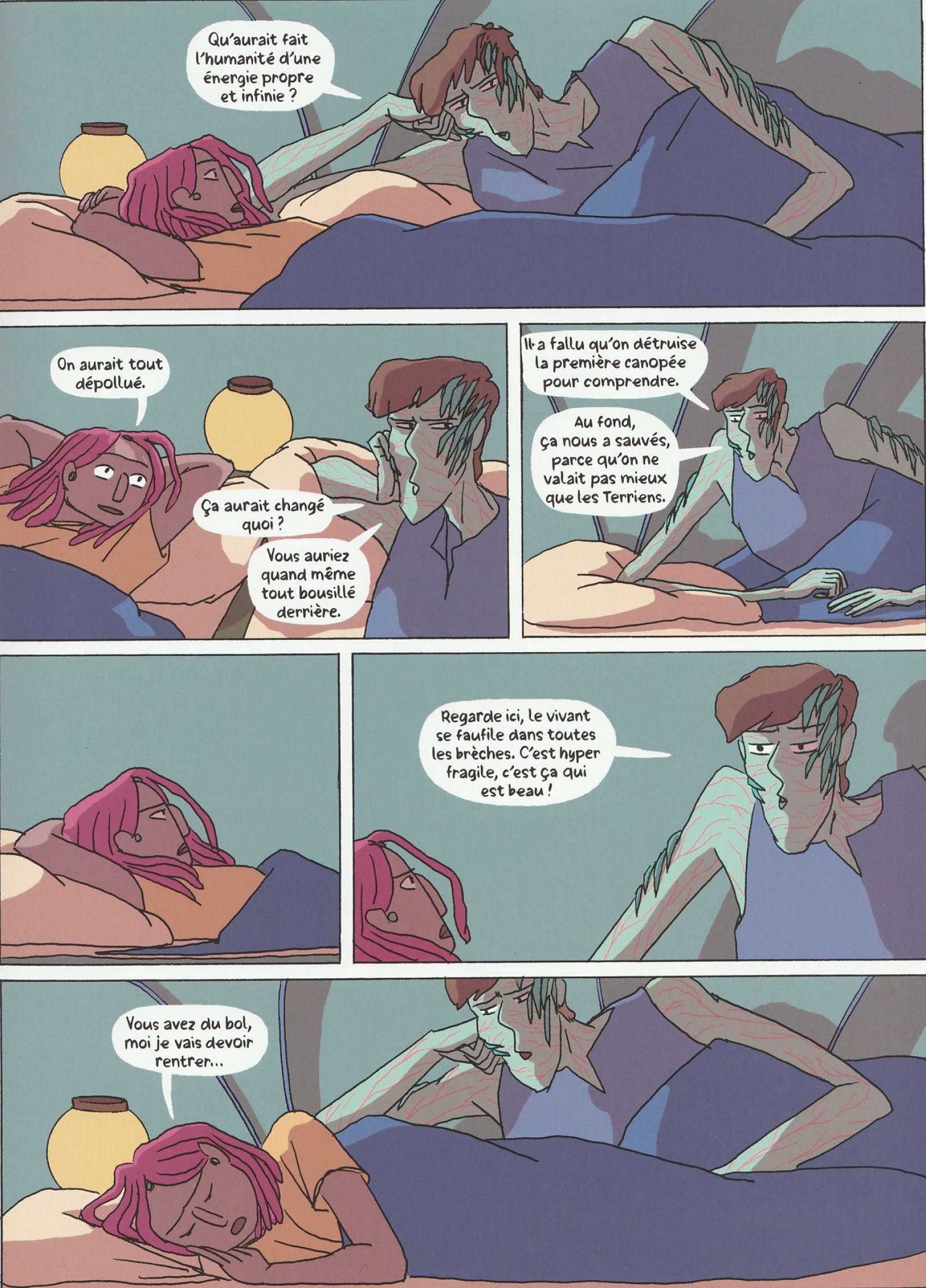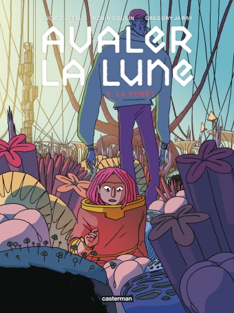 Notre époque est pleine de contradictions. D’un côté, les Français se sont prononcés massivement contre la loi Duplomb et pourtant l’écologie n’est toujours pas une priorité. Pire, outre-Atlantique, le pouvoir et certains gourous de la Silicon Valley promettent que la solution ne pourra venir que les Sciences. Les jusqu’au-boutistes affirment même que la seule solution serait l’exil interplanétaire. Partant de tous ces discours, Robin Cousin et Grégory Jarry imaginent une histoire mêlant anticipation, écologie radicale et conquête spatiale. Après un premier album d’ouverture qui faisait la part belle au passé grâce à de nombreux flashbacks, ce deuxième opus nous propulse à la fois sur la Lune et dans le temps présent d’Agafia. C’est pourtant par une analepse que s’ouvre cet album. Lâchés par les États, les scientifiques n'ont pas pu terminer leur dépollueur et ils sont contraints de passer au plan de secours. Dans ce cadre, Aleksander, Jonas et Paloma ainsi que quelques autres spécialistes entrent en hibernation au sein de leur exotérus. Mais d’Agafia, il n’en est pas question ! C’est alors qu’on se réveille dans la peau de cette même Agafia. Les scénaristes sont malins car ils laissent en suspend le passé de la jeune fille. Arrivée sur la Lune, elle est grièvement blessée. Elle ne doit la vie qu'aux habitants du satellite terrestre. Ce ne sont pas des sélénites mais bien les descendants des ouvriers. Pour survivre, ils se sont mis à manger de la nourriture produite sur place et, conformément à la théorie de Darwin, ils ont évolué jusqu’à ne plus faire qu’un avec la flore lunaire. Une grosse partie de l’album participe de la présentation de cet écosystème extrêmement fragile et qui est menacé par la mise en marche du générateur. Un choix tragique pour Agafia qui s’est rapproché d'Edrigu. Et puis, il y a le rebondissement final qui rebat les cartes et promet un ultime album en apothéose. Pour mettre cette histoire de science-fiction écologique radicale en images, il fallait une artiste forte et sensible. Lucie Castel opte pour un trait à la fois vif et géométrique tout en lui insufflant une bonne dose de d’émotions. Les personnages sont remarquables, mélange de caricatures et d’hyper-expressivité. Si dans l’espace, personne ne peut vous entendre crier, force est de constater que nos yeux se régalent avec l’écosystème imaginé pour la Lune. Les paysages sont variés et très chamarrés. Même si l’obscurité est de mise, les arrière-plans se parent de rose, d’orange, de pourpre très lumineux. C’est d’autant plus remarquable que cela n’interfère absolument pas avec le message des scénaristes. Mieux, cela renforce le malaise d’Agafia et, par ricochet, le nôtre.