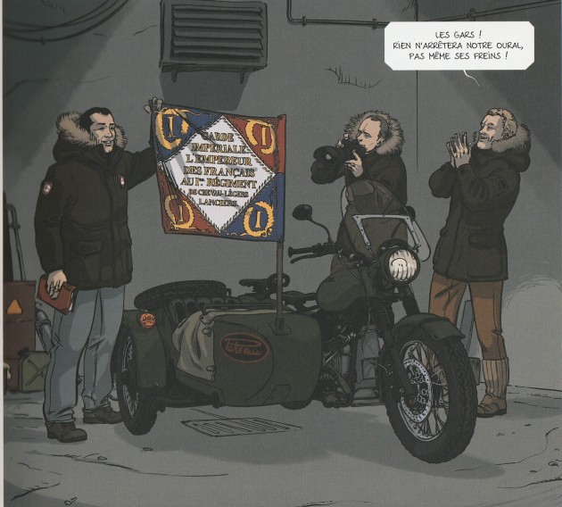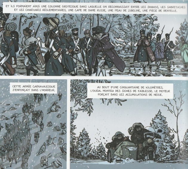 les ruines fumantes qu’a quitté l'empereur. On pourrait se dire qu’avec leur side-car soviétique, le trajet sera moins apocalyptique qu'il y a 200 ans. Et pourtant, si les montures sont plus modernes, elles peuvent se montrer aussi rebelles. Si l'équipement est meilleur, le froid reste toujours le pire ennemi. Loin de s'affliger sur son sort, qu'il a préalablement voulu, Sylvain Tesson rend hommage aux soldats. Il prête sa voix à ces milliers d'anonymes qui, pour le prestige de leur empereur et de leur patrie, sont morts aux confins de l'Europe. C'est aussi l'occasion pour Sylvain Tesson de nous donner à voir ce qu'il reste de cette épopée : pas grand-chose ! Et cette critique de notre société est aussi caustique que judicieusement adaptée en BD. Par la suite, Virgile Dureuil fait le choix d'un dessin ultra réaliste. Les images contemporaines et historique se superposant rapidement établissent encore une plus grande connexion entre les deux époques. Et puis, tout doucement, le froid se fait moins mordant, la neige fond et on retrouve les paysages familiers des plaines champenoises avant de terminer ce voyage devant le Panthéon avec une question : qui est vraiment Napoléon ?