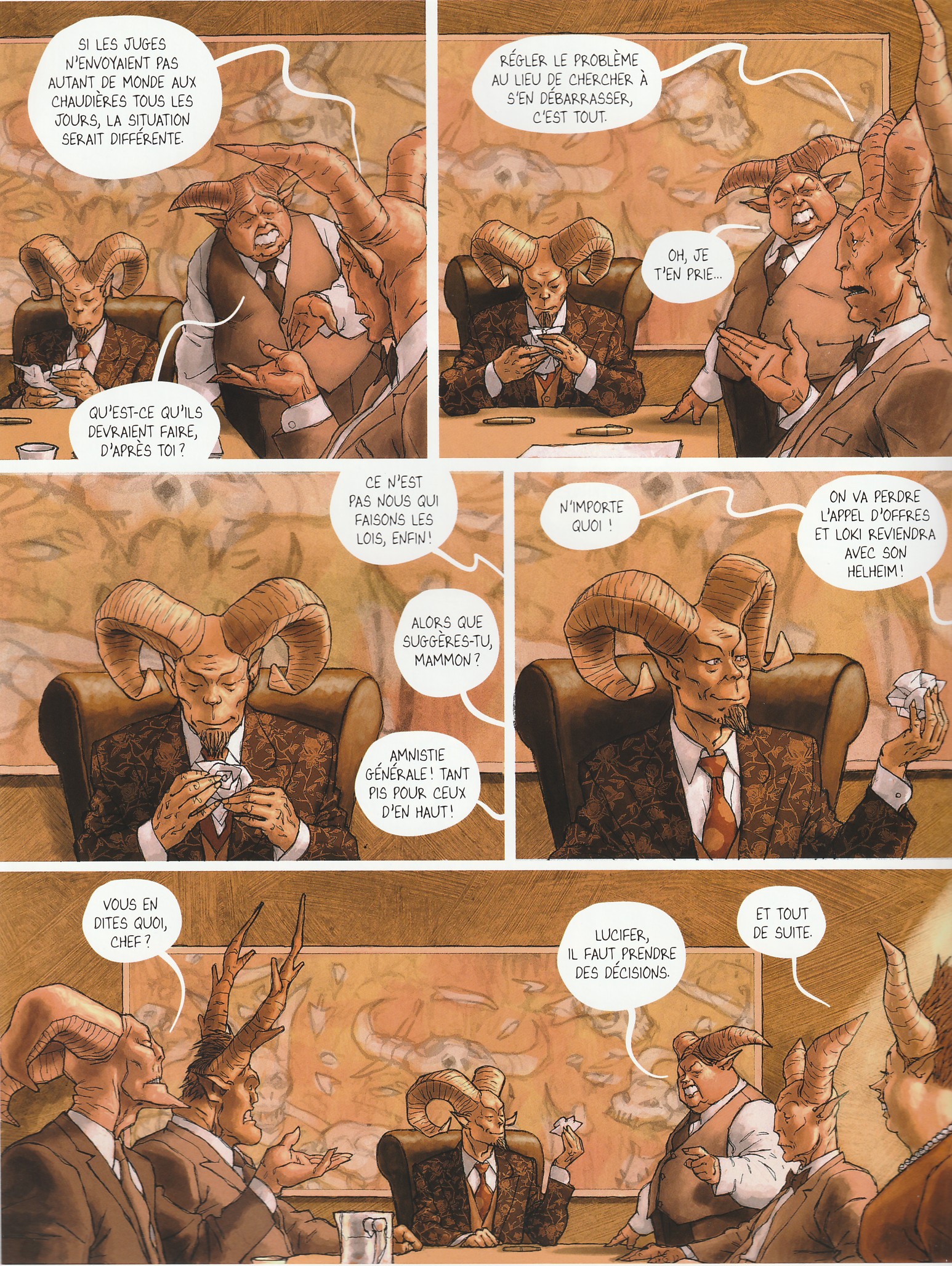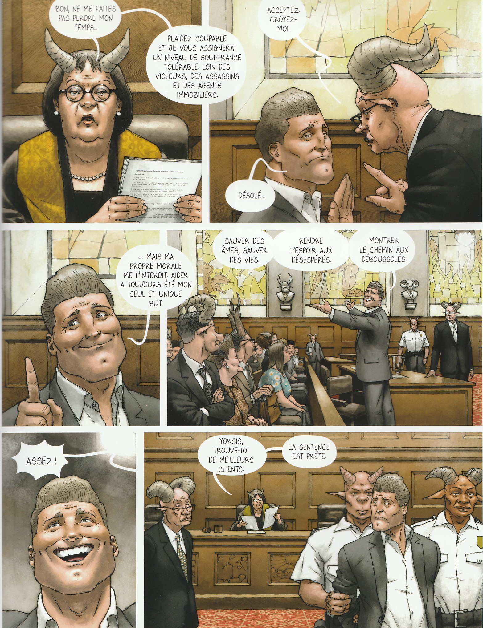 Dans notre monde peuplé de pervers narcissiques, dans nos sociétés de plus en plus connectées, vous pouvez faire confiance aux Autres afin de vous aider à tenir le cap. On ne compte plus les sites et les applications de coaching pour tout, et surtout pour rien. Ces gourous d’un nouveau genre ont même trouvé une nouvelle assistance : l’IA ! Mais jusqu’où sont-ils prêts à vous emmener ? Pour Diego Agrimbau, la réponse est simple : jusqu’aux Enfers. C’est ainsi que le scénariste imagine la mort, tragique et bête, bref désopilante, du plus grand des gourous du développement personnel. Contre toute attente, ce sont les portes de Pandemonia qui s’ouvrent devant lui. Refusant la fatalité, Ismaël va confier son sort à la justice démoniaque. Jusque-là, rien que de très ordinaire ! Oui mais voilà, les enfers sont en crise. Depuis plusieurs ordonnances divines, Pandemonia littéralement submergée. Pour un oui, pour un non, les nouveaux venus sont condamnés ! Cette phase d’exposition, où l’on croise conseil d’administration avec tout ce qu’il peut regorger de jalousies et de rancœurs est très drôle. La suite l’est tout autant. Face à une justice implacable, Ismaël est bien contraint d’avouer qu’il n’a pas toujours été un Saint et, en tant que tel, il est condamné aux pires tourments. Mais je ne peux pas en dire plus sans tout divulgacher ! Ce qui compte surtout, c’est le rythme d’enfer auquel les péripéties s’enchaînent autour des deux héros, ou plus exactement des deux anti-héros que sont Ismaël et Lucifer. L’autre élément tordant est le soin apporté au dialogue et en particulier au choix des noms des personnages secondaires. C’est drôle, c’est acide, c’est excellent ! Il ne faudrait pas oublier non plus de parler du dessin afin de compléter ce tableau infernal. On observe là aussi le soin apporté à la représentation des démons. Certes, et comme le veut la légende, tous ont des cornes ; mais dans le règne animal, ce ne sont pas les cordes qui manquent. Bouc, taureau ou gazelle, ces gardiens des enfers ont donc l’embarras du choix. Et pour le lecteur, c’est aussi efficace que les traits caricaturaux. Pour le reste, Pandemonia est une imposante mégalopole d’inspiration steampunk, royaume d’un baron samedi vautour. Les intérieurs deviennent réalistes et les extérieurs sont teintés d’orange et d’ocre, totalement en lien avec l’ambiance infernale. Reste la construction qui fait la part belle aux grandes cases et qui assure une grande fluidité dans les dialogues tout en assumant, par moment, des plans fixes; preuve d’une lenteur de telle ou telle institution.