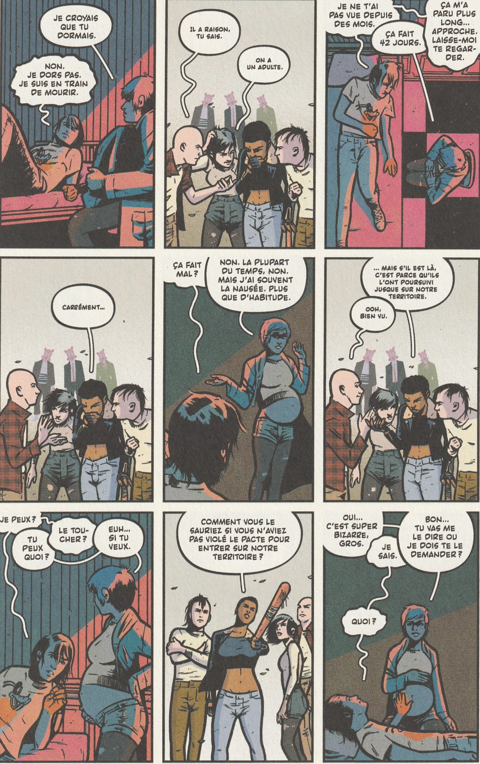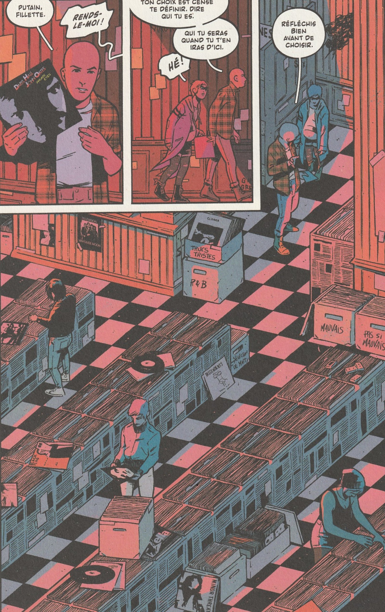 Sid est fière ! Parmi les milliers de vinyles que compte la boutique, elle a enfin trouvé le sien ! Celui qui doit la définir, celui qui lui servira de guide, de Dieu. C’est à ce moment qu’on frappe à la porte et qu’on découvre que le magasin est un véritable bunker qui sert de refuge à une bande d’ados disparates. Parmi eux, Sid, bien évidemment, avec son ventre bien arrondi, mais également Prufrack, inquiet de devenir adulte, ou encore Alabama, qui endosse le rôle de chef. Derrière la porte, c’est Slug, un jeune qui avait mystérieusement disparus, et qui est dans un sale état. Mais avant de lui ouvrir la porte, il faut vérifier car, derrière, il y a aussi, et surtout, la violence et le chaos d’un monde qu’on imagine postapocalyptique où seuls les ados survivent. Peu de temps après, Sid disparaît et toute sa bande est contrainte de partir à sa recherche. Ils vont s’opposer aux autres groupes : la bande des cochons, celle de la fête foraine ou les gars en bleu. Plusieurs questions restent cependant en suspens. Comment en est-on arrivé là ? Qui sont ces étranges étrangers masqués ? Qui est-il arrivé à Sid ?
