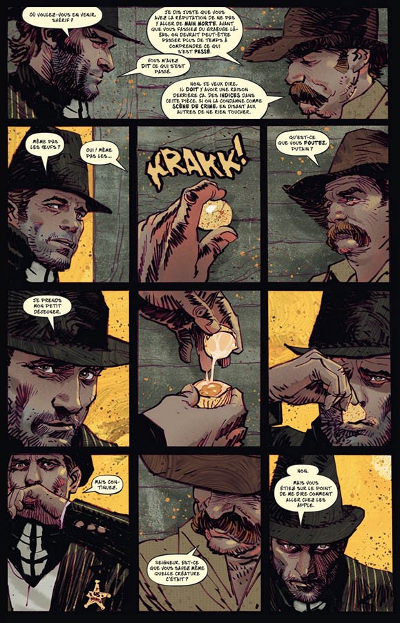 d'un Marshall, héros de romans à 2 sous et d'une mine désaffectée des plus inquiétantes. Dès l'ouverture, l'auteur donne le ton, ouvrant sur un meurtre sanglant réalisé par un enfant à qui on donnerait le bon Dieu sans confession. L'intrigue est rondement menée et nous tient en haleine du début à la fin. Le récit est fluide et les dialogues s'enchaînent avec un grand naturel. Le personnage incarnant le marshall est charismatique avec une certaine ambivalence, le rendant plus humain. Le Récit est ponctué de flash-back, nous expliquant les raisons qui ont conduit le Marchall il y a quelques années dans la ville de Canary, des petits retours en arrière bien sentis qui nous permettent de comprendre les raisons de l'ambivalence et de la dualité de notre héros. Le dessin, Fait d'un trait fin et réaliste est en totale adéquation avec le récit. Le découpage somme toute classiques fonctionne à merveille, et la colorisation très saturée vient accentuer le côté oppressant et sombre du récit. Vous l'aurez compris "Canary" est une très belle surprise, un coup de cœur pour ce western singulier et prenant, nous offrant un excellent moment de lecture.