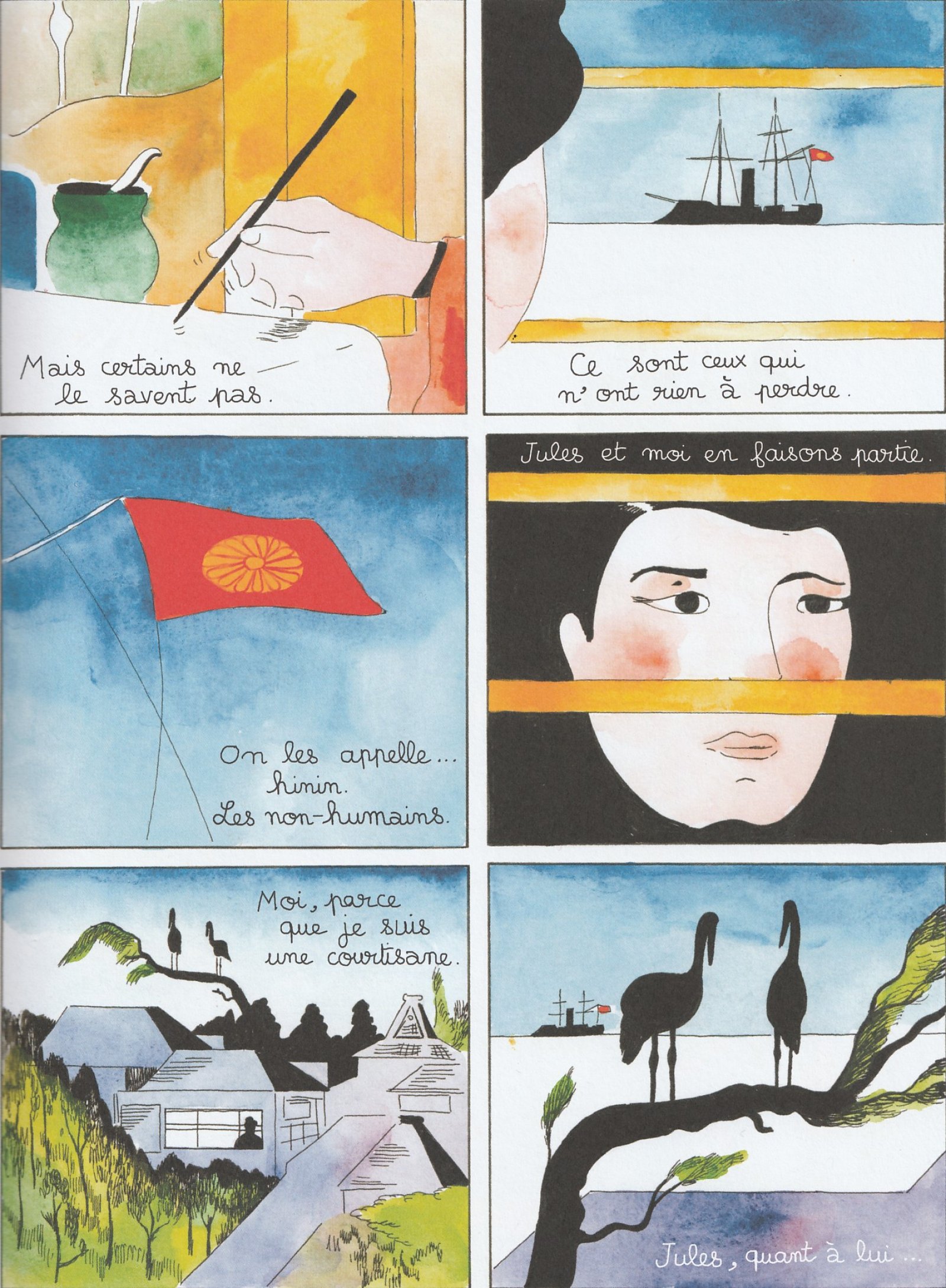 Dès la couverture, cet album intrigue. Que fait cet individu répondant aux stéréotypes écossais, armé qui plus est, sur fond de drapeau du Japon impérial ? L’ouverture de l’album n’apporte aucune réponse. Une courtisane observe un héron par la fenêtre tandis qu’au loin, un navire de guerre menace. Pourtant, c’est bien ce héron qui va nous faire remonter le temps et changer de continent. C’est la geisha qui nous raconte l’histoire de Jules. Fils d’un vétérinaire de Belfort, il est né et a grandi avec les cheveux roux. En ce milieu du XIXe siècle, cela suffit à faire de lui la cible de moqueries et de violences. Puisqu’on le traite comme un démon, Jules décide de le devenir. Il s’introduit dans une maison bourgeoise, mais tombe nez à nez avec la maîtresse des lieux, qui met fin à son intrusion. Tout naturellement, Jules est accusé et condamné pour assassinat. Pour éviter l’échafaud, il s’engage dans l’armée de Napoléon III. C’est ainsi qu’il découvre le monde… et lui-même. Le récit d’initiation est parfaitement construit, avec ce qu’il faut de flashbacks, de souvenirs hantés et de prolepses. C’est la biographie d’un homme différent, marqué par le regard des autres, jusqu’à parvenir à se définir lui-même. Le portrait d’un homme qui aime les femmes, même lorsqu’elles le mènent à sa perte… jusqu’à ce que le hasard le mette sur le chemin de celle à qui rien ne le prédestinait, mais qui saura l’aimer tel qu’il est ; et qu’il aimera en retour. Si cette histoire touche au plus profond de nous, c’est sans doute grâce aux dessins d’Antoine Cossé. Le dessinateur travaille à la manière des grands aquarellistes : chaque vignette devient une œuvre à part entière. À l’image des artistes du XIXe siècle, il mêle avec maestria romantisme et violence, poésie et brutalité du monde. Le résultat, à la fois original et puissant, ne laisse pas le lecteur indifférent.