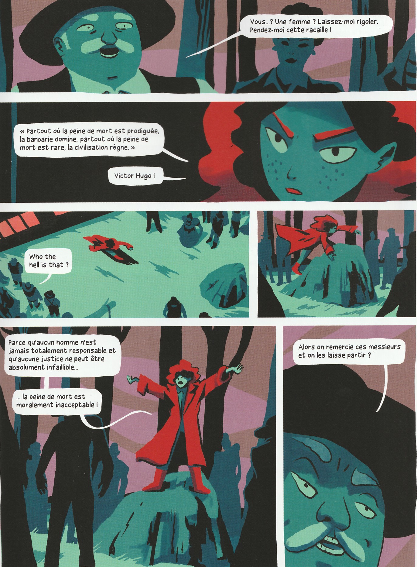 Une fois n’est pas coutume, je commencerai l’évocation de ce roman graphique par sa conclusion. Victor Coutard clôt son récit par deux pages consacrées aux pionnières de la justice et à quelques grands principes de droit. Rébarbatif, direz-vous ? Pas vraiment. À l’heure où les idées illibérales gagnent du terrain un peu partout, ce rappel a le mérite de remettre certaines choses à leur place. Surtout, il éclaire les motivations de l’héroïne de cette histoire aussi engagée que décalée. Tout commence au milieu du XIXe siècle, à Orléans. Le grand Napoléon a édicté son code, faisant de la femme une éternelle mineure. Pourtant, le procureur de la République a élevé sa fille dans le respect des idéaux des Lumières. Elle a également hérité du tempérament farouche de sa mère. Le résultat : une jeune femme libre, rebelle, déterminée à bousculer l’ordre établi pour rendre la justice. C’est ce caractère incandescent qui, un soir de beuverie habituelle, la pousse à tout quitter pour tenter sa chance de l’autre côté de l’Atlantique. Victor Coutard dresse ainsi le portrait d’une héroïne en quête d’émancipation, une femme qui brise les codes ; et qui, à bien des égards, détonnerait encore aujourd’hui. Le scénariste ne se contente pas de ce portrait : il peuple son récit d’une galerie de personnages secondaires hauts en couleur à faire pâlir de jalousie les Daltons. Mais rien n’est gratuit : chaque situation, chaque injustice corrigée par la shérif Cécile renvoie en creux aux dérives de notre XXIe siècle. Impossible, enfin, de ne pas évoquer le trait intemporel de Walter Guissard. Son dessin, vif et dynamique, précis et toujours en mouvement, confère à l’ensemble une énergie communicative. On pense parfois au théâtre, tant les postures sont expressives et volontairement accentuées pour servir les intentions des personnages. Les couleurs, vives et contrastées, renforcent encore la lisibilité et le rythme du récit.