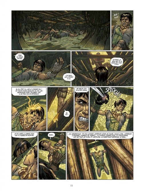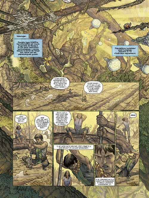 Avec chasseurs de sève, Alexandre Ristorcelli parvient à pleinement s'approprier l'univers inspiré par Laurent Genefort. Il retranscrit parfaitement cet univers singulier, ce planète-opéra immersif, à la fois fascinant et terrifiant. Une quête qui nous mène au cœur d'un péril écologique qui n'est pas sans rappeler les inquiétudes actuelles de notre propre monde. Dans ce monde végétal, les humains vivent de façon archaïque, regroupés en clans, ayant chacun leur propre rite, religion, et interprétation sur l'origine de leur monde et vivant chacun à des niveaux différents de l'arbre. C'est très bien écrit, le rythme est bon, les pages se succèdent enchaînant actions, humour et révélations. Avec cet album, l'auteur réalise une performance de haut vol tant du point de vue scénaristique que du point de vue graphique. Il parvient à nous embarquer dans un univers singulier, avec des personnages riches et attachants et un bestiaire foisonnant de créatures plus impressionnantes les unes que les autres. La mise en page est dynamique assurant une lecture des plus fluide. Le dessin est précis, fourmillant d'informations. Le trait fin et réaliste, agrémente un décor fait d'arrière-plan somptueux venant accentuer le côté immersif du récit. On en prend plein les yeux, captivé, au cœur de cet océan de verdure, on a qu'une envie, être à leurs côtés et entamer cette quête désespérée afin de sauver ce monde en perdition. Un One shot savoureux, rythmé, rempli d'action et d'humour.