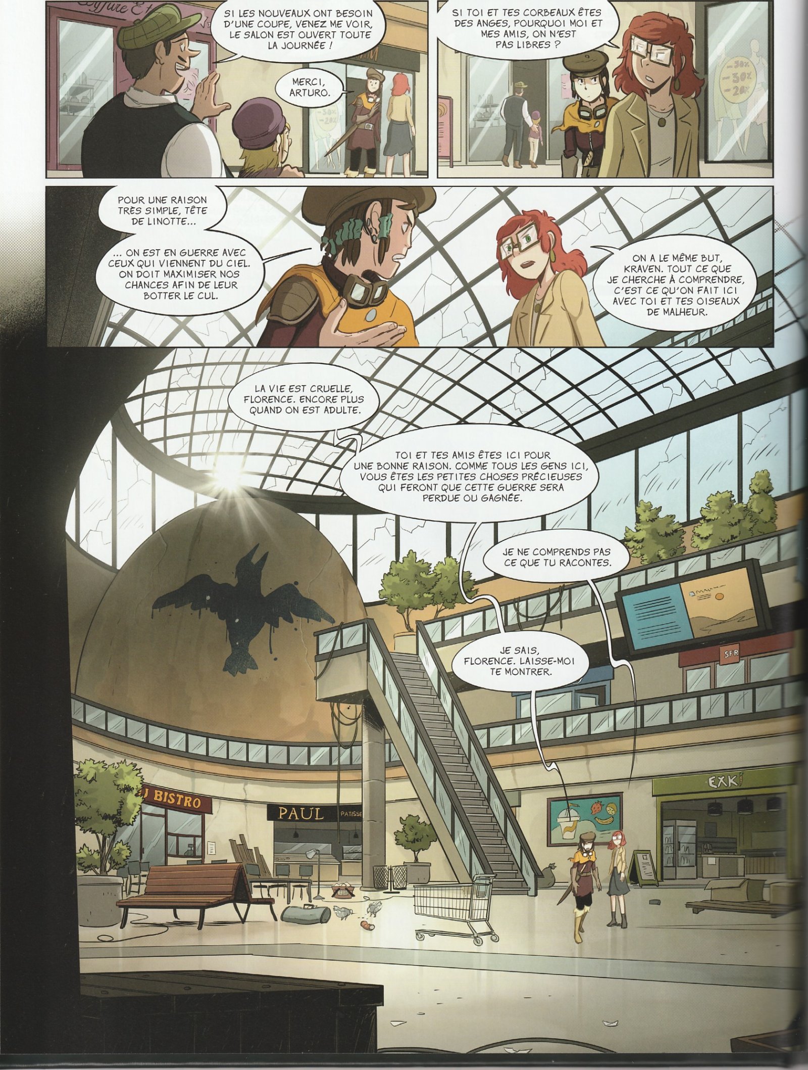 L’opération de sauvetage laisse un goût amer à Lena et à ses amis. S’ils ont secouru la fille Blouet, récupéré une armure et capturé un Autre, ils ont perdu Yann, blessé et toujours inconscient. C’est donc Florence qui prend les rênes et organise le voyage. Avec le pick-up, de l’essence et des vivres, ils devraient pouvoir rejoindre leur Bretagne natale. Pourtant, une crainte subsiste. Le mystérieux alien semble avoir des capacités hypnotiques et il faut à tout prix éviter de le regarder dans les yeux. Pour ne rien arranger, après quelques heures de route, le groupe se retrouve, dans une ville inconnue, aux prises avec le clan des corbeaux. Sous la direction de Kraven, il offre le gîte, le couvert et la protection en contrepartie d’activités essentielles et de dons de sang afin de soutenir les militaires au front. Contrainte, Florence accepte d’aider les corbeaux… pour le moment. C’est alors que Yann sort du coma…