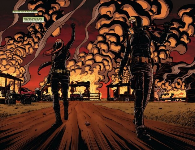 Vendredi 13, les chasseurs constituent un mystère et même leurs crimes ne sont que suggérés, renforçant ainsi la crainte de Sarah et Jeannette ; mais surtout du lecteur. La référence cinématographique ne s'arrête pas là. On en sent l’influence dans le dessin de Jonathan Brandon Sawyer. Alternant plans larges et gros plans, le dessinateur américain est également très à l'aise avec les cadrages subjectifs et les actions hors champs. Il sait apporter la juste dose de réalisme et de vivacité à cette histoire particulière sanguinolente. Pour leur seconde collaboration, scénariste et dessinateur sont en parfaite harmonie et cela se ressent. On prend plaisir à dérouler les pages, on frémit à chaque bruit suspect et on reste abasourdi par la volonté de ces deux filles. Quand à la chute, je n’en parle même pas !