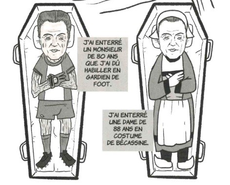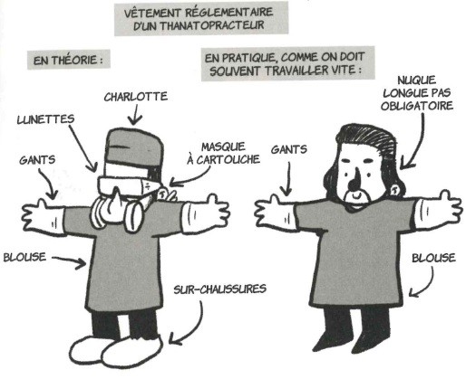 Si on connaît l'humour noir de Davy Mourier, on se dit qu'il arrivera à point nommé lorsqu'il découvrira la profession de thanatopracteur. C'est ici le propre même de l'auteur d'arriver à parler de sujet sérieux de manière très documentée mais en même temps décalée. Ce sera un moindre mal quand on apprendra que les thanatopracteurs n'ont pas toujours le temps de mettre certains équipements ou de pratiquer telle ou telle opération comme "mécher les orifices".