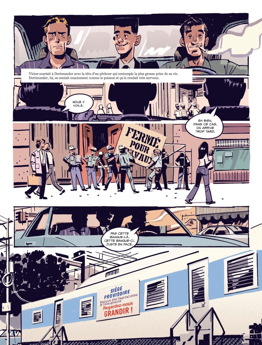 L’album Bank Shot n’échappe pas à la règle : comment imaginer voler une banque installée sur des parpaings à l’intérieur d’un mobil-home ? C’est toute l’aventure proposée au fil de 120 pages, où le lecteur devient spectateur de décisions toujours plus absurdes et d’actions aussi imprévisibles que déconcertantes. Les personnages, eux, restent convaincus du bien-fondé de leurs choix et ne rient jamais de la situation. De l’autre côté, les lecteurs oscillent entre éclats de rire et incrédulité, se demandant : « Mais ils sont sérieux ? ». Forcément, le suspense opère : jusqu’où cela va-t-il les mener ?