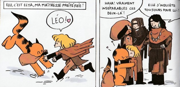 Elya et sa tribu. Alors, bien sûr les préhistoriens vont s'arracher les cheveux sur les gros, les très gros anachronismes. Ils peuvent se rassurer, Milena, l'auteure en est totalement consciente ; elle qui l'explique avec beaucoup d’humour dans un carnet bonus qui regorge d’informations complémentaires sur les animaux que la petite troupe rencontre au cours de sa migration. Là où l'histoire est en revanche très instructive, c'est sur les caractéristiques des premiers Homo sapiens : nomades, ils vont passer du statut de chasseur-cueilleur à celui d'agriculteur. Une fois remis de l'anachronisme (qui ne bouleversera absolument pas les enfants), on découvre une intrigue assez simple mais extrêmement bien menée. Léo doit protéger le campement des terrifiants « oiseaux à l'air pas sympa ». Mission compliquée pour un chasseur qui doit se reconvertir en gardien. Heureusement, Léo peut compter sur le soutien d’Elya et de toute sa tribu. Maline, l'auteure place déjà les jalons du deuxième épisode mais là, je n'en dirai pas plus. Côté dessin, on trouve rapidement la source d'inspiration : rien de moins que le génial