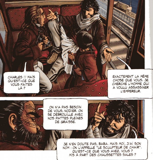 Mais parlons de l'album en lui-même, l'histoire met nos deux héros aux prises avec un formidable adversaire, qui constituera sans doute le principal antagoniste de ce nouveau cycle. En plus, de représenter une menace pour l'Empire, les enjeux sont plus personnels pour Charles Nodier qui croit voir dans le Sculpteur de Chair la créature venue des étoiles qu'il traque depuis 15 ans. Sans être révolutionnaire, l'histoire est plaisante, le principal intérêt de la série étant de nous faire passer un bon moment en compagnie de héros mémorables (et l'inénarrable Baba est là pour ajouter une touche d'humour) tout en nous faisant découvrir une uchronie au formidable potentiel. Et sur ce plan, l'album tient ses promesses : après les Indes dans le premier cycle, on découvre l’Égypte et on y croise un surprenant Honoré de Balzac...