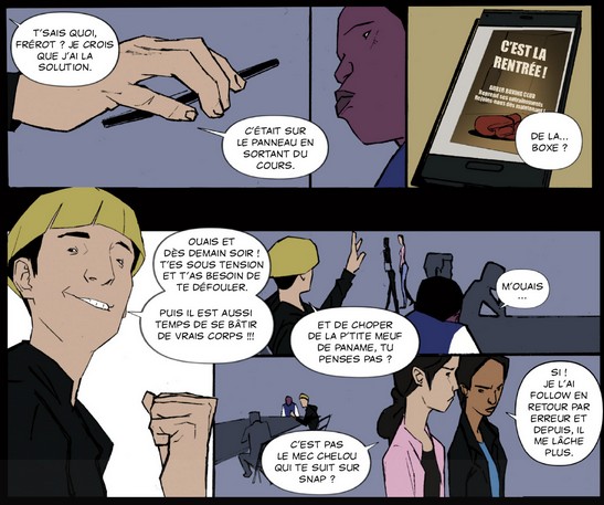 Aubervilliers, quartier des Quatre-chemins. Seydou est un jeune adolescent dont la vie a été bouleversée pendant l’enfance par la mort d’un proche lors d’un drame. Après avoir été témoin d’une agression, ils décident, avec son ami Elias, de pousser la porte d’un club de boxe. Un uppercut graphique et social à découvrir !