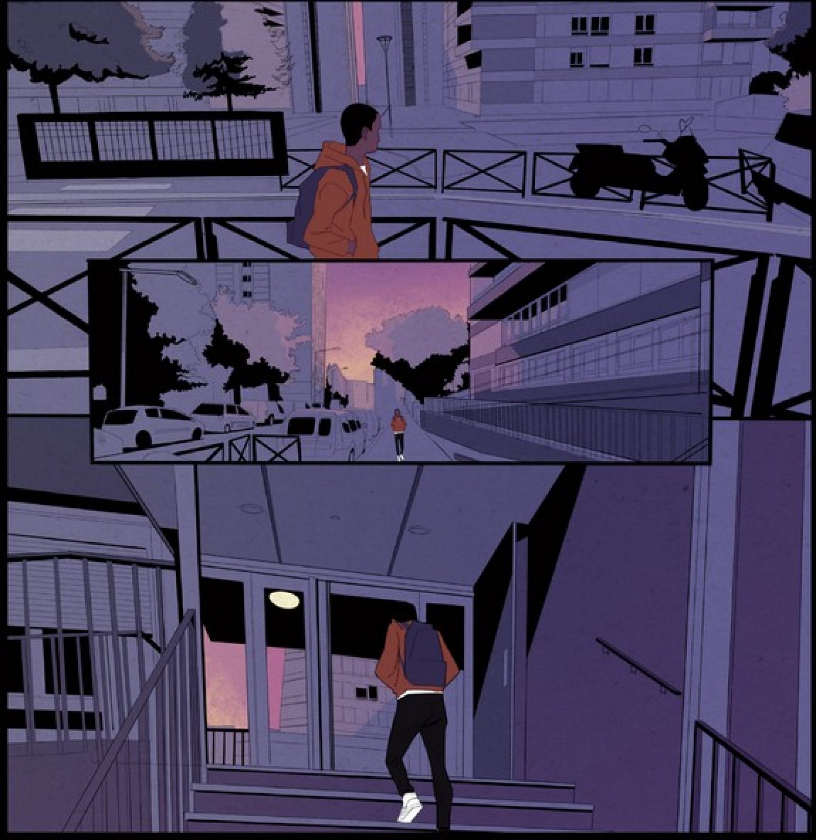 Graphiquement, Entre les cordes est une claque visuelle ! Les décors urbains sont magnifiques mettent en valeur Aubervilliers qui devient presque un décor de cinéma ! On déambule dans les rues avec nos héros, entre le béton des cités et la chaleur moite de la salle de boxe. L'utilisation des couleurs est également un point fort, avec des teintes fortes et saturées qui soulignent l'urgence du propos.