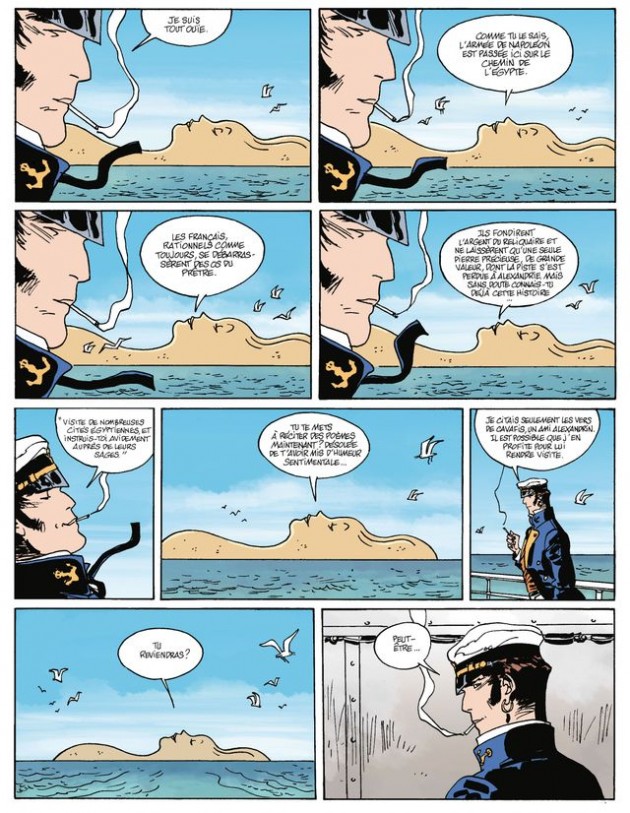 Une gêne s’installe dans mon cœur : pourquoi cet album veut absolument me faire penser à tous les autres ? On y retrouve tout ce qui fait un Corto Maltèse mais peut-être en trop grand nombre :onirisme quand le personnage se met à parler à l’ile de Malte, poétique lorsqu’il se rend chez un de ses amis à Alexandrie, puis plus tard un être cher perdu à retrouver en pleine forêt. Il ne manque plus que la franc-maçonnerie et Raspoutine...