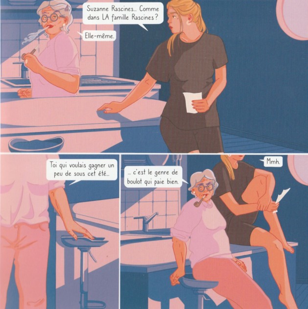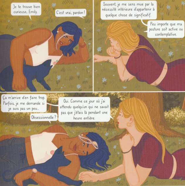 , il y a des moments de doute et de tension et ceux-là ne manqueront pas d’avenir. La scénariste insère également une intrigue familiale et sociétale à travers des questions comme « un homme peut-il faire sien les talents de son épouse ? » ou « qu’a-t-on fait pour mériter la fortune de nos parents ? ». Mathilde Ducrest interroge notre société et nos valeurs. C’est en substance l’évolution de notre société qui nous est également racontée ici. Côté dessin, l’approche me semble différente. Le trait quelque peu figé, les représentations un peu inégales apportent un côté faussement naïf. L’autre originalité tient à la construction : avec une majorité de cases larges et de double cases, cela renvoie à merveille à l’équation 1+1=2. Avec une telle couverture, difficile enfin de ne pas évoquer la colorisation. Tantôt luxuriante dans les serres de Suzanne, parfois plutôt ternes lorsqu’il est question de souvenir, la couleur est une composante primordiale de l’histoire. Au final, l’ensemble fonctionne bien et devient véritablement la griffe Ducrest.