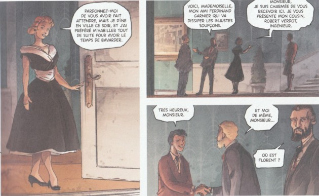 Gaby est une œuvre inédite et quelque peu oubliée. Entre les deux styles, difficile de ne pas faire une comparaison. Première différence, de taille, cette Gaby est totalement inconnue du public. On l’a dit, cette œuvre étant inédite, personne ne l’a jouée ou vue. Impossible donc de se l’imaginer ! Mais impossible aussi d’avoir ce sentiment de familiarité. On pourrait aussi trouver une quelconque difficulté dans les règles théâtrales mais le 9e art s’y adapte plutôt facilement. Le principal écueil de cette adaptation tient dans la volonté de la scénariste de respecter au maximum les répliques. Bien sûr, cela colle parfaitement au texte, mais cela alourdit la lecture et ralentit le rythme. C’est d’autant plus dommageable que le scénario est plutôt bien construit. Après une exposition précise, on entre dans une intrigue mélangeant comédies classique et de boulevard, Molière et Guitry, en passant par Alexandre Dumas. Une courtisane fauchée se voit proposer