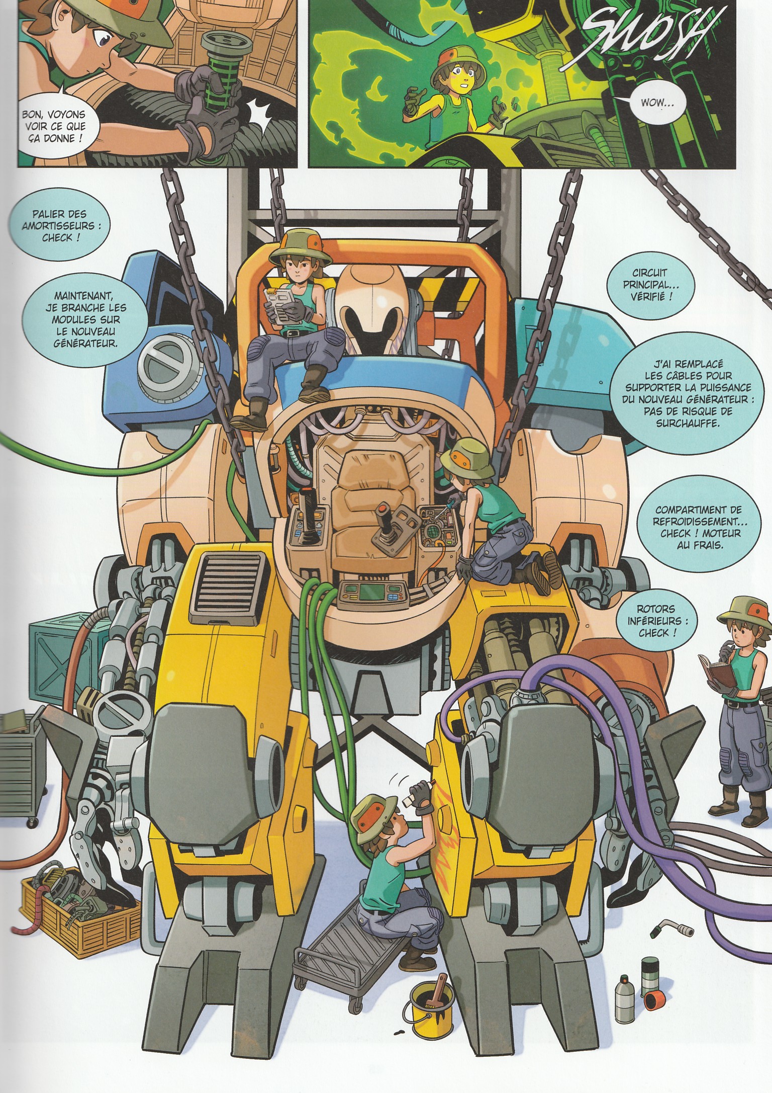 Il y a une vraie montée d’émotion dès l’ouverture de l’album — et je ne parle pas seulement du poster de mecha offert ! Non, je fais surtout référence à la dédicace de Christophe Alliel : « Pour mes fils ». Je vous rassure, je ne suis pas tombé dans le sentimentalisme, mais cette phrase éclaire les influences et les inspirations qui nourrissent l’œuvre de l’artiste. Depuis Spynest, les lecteurs l’ont vu explorer de multiples horizons, sans autre fil conducteur que la force de son imagination. Une fois encore, Alliel nous plonge dans un univers manga immédiatement reconnaissable, rappelant les Gundam et autres Golgoths menaçant la Terre. Les lecteurs les plus littéraires y verront peut-être plutôt un clin d’œil à La Guerre des mondes. Progressivement, cependant, le récit se resserre autour d’une figure plus intime : celle d’un Rémi sans famille transposé dans un monde post-apocalyptique. Cet emboîtement d’échelles est particulièrement habile : le cadre global finit par s’effacer au profit des aventures de Soni et de Dumpling — et c’est précisément ce qui fait leur force. Bien sûr, d’autres protagonistes viennent enrichir ces péripéties : certains s’identifient rapidement, d’autres conservent une part d’ombre, et les révélations restent toujours possibles. La structure narrative demeure classique dans sa fonction d’ouverture, mais la présentation est rythmée par des rebondissements suffisamment nombreux et bien orchestrés pour rendre la lecture captivante et fluide. Côté dessin, le style distinctif de Christophe Alliel s’affirme pleinement : l’influence japonaise est omniprésente, tout en s’intégrant à une mise en scène et un découpage hérités de la tradition franco-belge. Le mariage fonctionne à merveille. Les cases s’enchaînent sans accrocs, les pages se tournent sans qu’on y pense, et les ellipses surviennent au moment juste pour dynamiser le récit. Les personnages, expressifs et lisibles, incarnent parfaitement leur caractère — un choix cohérent pour une œuvre destinée à la jeunesse. Cette intention se retrouve également dans la colorisation, aux teintes vives, qui atténue toute dimension anxiogène et renforce l’énergie du récit. Enfin, comme un écho au poster d’ouverture, le dossier bonus — pensé comme ceux des anciens DVD d’un autre âge — se révèle aussi instructif qu’appréciable. Il offre un aperçu détaillé de la création de l’album et distille des informations qui, sans aucun doute, prendront tout leur sens dans les prochains tomes.