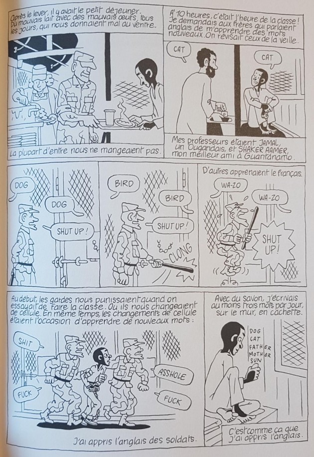La vie de Mohamed EL-GORANI est racontée avec pudeur par Jérôme TUBIANA qui a pu le rencontrer quelques fois après sa libération. L’auteur nous permet d’apprendre ainsi dans un appendice les problèmes que l’ex-détenu le plus jeune de Guantánamo a rencontrés et ceux qu’il continue d’avoir dans les différents pays dans lesquels il a séjourné. De son arrestation à sa détention kafkaïennes, on ne peut qu’être effarés de constater à quel point la machine judiciaire peut se révéler aveugle dès lors que l’émotion face aux horreurs terroristes a été manipulée par des intégristes politiques. Les fresques arabisantes ainsi que le choix du noir et blanc donnent à voir ce manichéisme imbécile et les souffrances iniques endurées par l’adolescent. La dimension didactique est également appréciable avec des rappels géographiques et les transcriptions de documents officiels américains qui permettent de mieux saisir la machine à broyer d’une bureaucratie militariste.