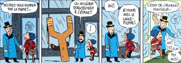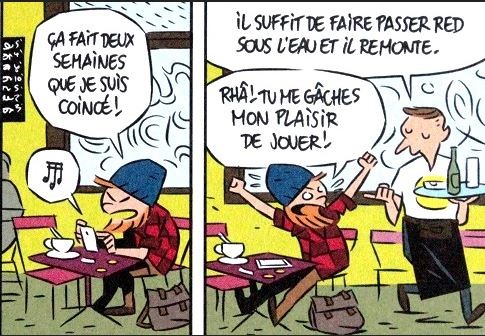 On connait tous les Angry Birds. Ce jeu de réflexion et de balistique où les oiseaux catapultés doivent détruire les châteaux de leurs ennemis cochons. Le phénomène mondial a donc été lance par le jeu vidéo avant de se voir décliner en peluches, films, parcs d’attraction et autres BD, chez Lombard. Ce qui est moins courant, c’est de s’attarder sur les gamers, sur ces accros de Red et Chuck, sur ces grands enfants qui savent rester petits. Cela tombe bien, c’est précisément le cœur de cible de la collection Shampooing de Delcourt. C’est le directeur de collection, Mr Lewis Trondheim, himself, qui signe le scénario de cette histoire qui lessive le cerveau. Premier rinçage, le format choisi est à l’italienne. Perso, cela faisait bien longtemps que je n’avais pas eu entre les mains ce genre d’objet. Surtout, la forme est totalement raccord avec le fond. Les scénettes se déroulent en bande unique sur une ou deux pages. C’est rapide, très agréable à lire et franchement drôle. S’il quitte l’atmosphère médiévale de Varulf, Hugo Piette conserve sa patte si particulière. Le dessinateur belge use de la ligne claire avec brio. Il réussit le chalenge de créer des personnages avec une profondeur en seulement quelques bandes. Il réussit même à alterner, un peu, ses mises en pages avec ce format si exigeant.
