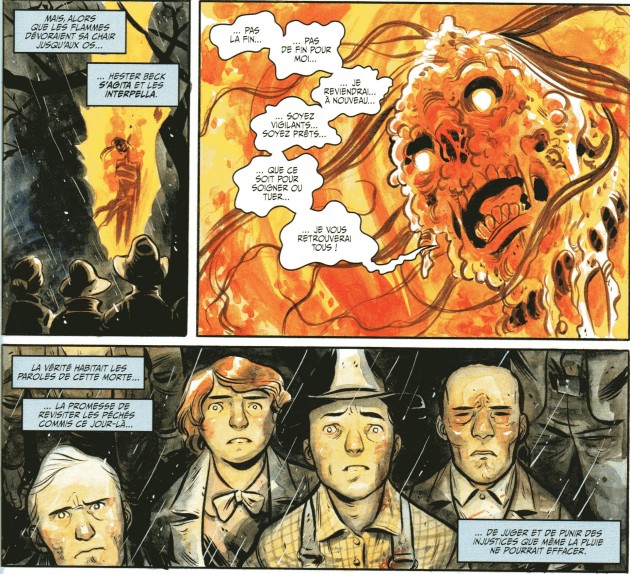 Quand vous voyez les noms du scénariste de The Sixth Gun et du dessinateur de B.P.R.D. L'Enfer sur Terre au générique d'une nouvelle série d'horreur, vous êtes en droit à vous attendre à du lourd, du très très lourd. Et le moins que l'on puisse dire est que l'on n'est pas déçu avec ce premier tome d'Harrow County qui a tôt fait de vous embarquer dans son univers à la fois inquiétant et envoûtant. C'est une vraie série d'horreur mais qui ne mise pas sur le gore ou sur la violence pour vous hameçonner. Elle préfère installer une ambiance fantastique et des personnages pour qui vous avez une immédiate empathie à l'instar de la jeune héroïne Emmy, jeune fille aux aspirations ordinaires qui fait face avec courage et opiniâtreté à un destin tragique. Le dessin contribue parfaitement à cette ambiance grâce à des créatures surnaturelles au design sans fioritures et aux couleurs pastelles qui fleurent bon le siècle dernier.