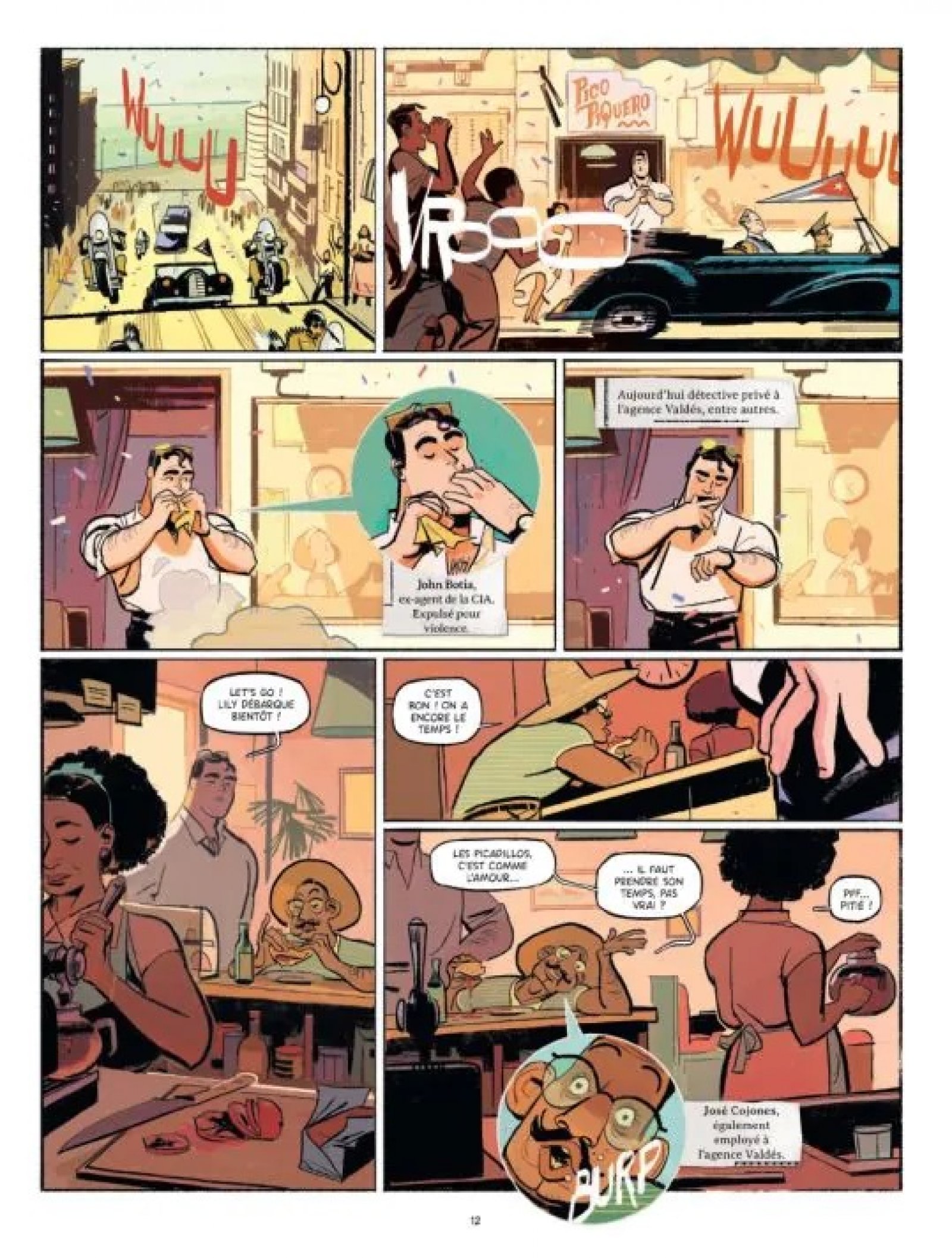 Cuba a une longue histoire politique entre 1928 et 1958, dirigée tantôt par des militaires, tantôt par des dictateurs avec en toile de fond la répression et la souffrance du peuple. De Geraldo Machado à Fulgencio Batista en passant par tout un tas de généraux, le pays est dirigé par une main de fer avec parfois les Etats-Unis en second rôle dans le paysage politique. Mais au moment où démarre cette aventure en 1958, Batista est encore au pourvoir et Fidel Castro commence à pointer le bout de son nez pour projeter de renverser le dictateur. Batista de son côté n’est pas plus inquiet que cela par tous ces barbus dans la jungle, il tente de rassurer ses amis américains comme il peut pour continuer à toucher des fonds. C’est à cette même période que John Botia (Ex agent de la CIA expulsé pour violence) qui travaille pour l’agence de détectives privés Valdès se voit confier, avec son collègue José Cojones, la mission de récupérer Lily, la fille du patron et étudiante à Miami qui va débarquer dans le port pour venir passer ses vacances auprès de son père. L’histoire balnéaire aurait pu s’arrêter là.