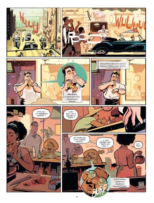 Lily a à peine le pied posé sur le sol cubain que l’aventure débute sur les chapeaux de roue par une première scène violente entre opposants et partisans de Batista et une explosion à la bombe. Heureusement elle retrouve rapidement John Botia et José Cojones qui sont tout étonnés de récupérer une jeune et jolie jeune femme alors qu’ils avaient laissé une gamine sur le quai il y a 8 ans. Lily n’en a pas fini pour autant avec les surprises. Passage par un petit match de base-ball où elle est sensée retrouver son père qui, au-delà de tenir une agence de détectives, est surtout un joueur compulsif qui a tendance à emprunter de l’argent à de mauvaises personnes, ce qui va avoir pour conséquence d’embarquer Lily et ses acolytes dans une mission de chantage et kidnapping.