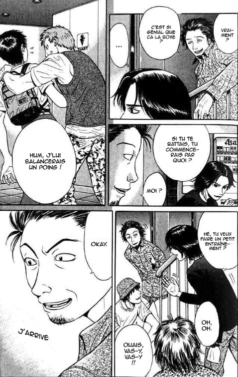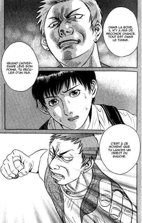 Malgré des dessins qui peuvent sembler classiques, l’art de Mori trouve sa force dans la fonctionnalité visuelle. Les expressions de Yû et sa physique peu imposante sont parfaitement rendues, renforçant ainsi l’authenticité du personnage. De plus, l’auteur accorde une attention particulière aux détails des combats, offrant aux lecteurs des moments d’action dynamiques. Les techniques de combat sont bien représentées, et Mori n’hésite pas à expliquer les subtilités de cet art, que ce soit la boxe, le judo ou les différentes approches martiales propres à la rue.