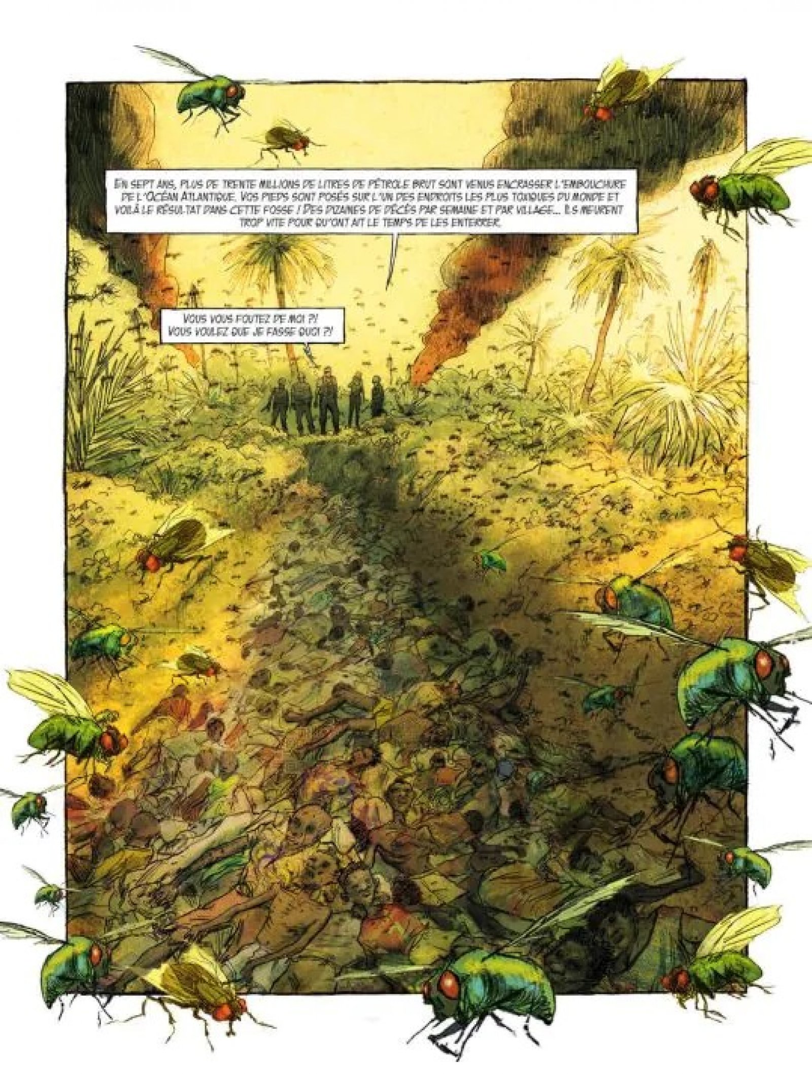 En 2020, dans le delta du Niger sous une chaleur étouffante, Le commandant Virgil Solal et ses hommes ont pour mission d’aller exfiltrer une missionnaire d’Amnesty International. Le type de mission qui exaspère Solal. En discutant avec la jeune femme, Virgil Solal apprend que le village le plus proche est encore habité malgré la marée noire qui a pollué toute la région. Et pour cause, les entreprises pétrolières ne cessent de déverser leur saloperie dans le secteur. La terre est morte, les eaux des puits empoisonnées par des métaux lourds, la population ne sait plus où se réfugier. La jeune femme arrive à convaincre Solal de déplacer les habitants du village vers le bidonville le plus proche. Mais avant de partir, elle fait découvrir aux militaires une fosse commune où des centaines d’hommes et de femmes sont entassés sans avoir pu avoir une sépulture décente. Virgil Solal décide alors de mettre le feu au charnier. Ces personnes sont nées dans le pétrole, nourries au pétrole, mortes à cause du pétrole et brûlées par le pétrole. Cette expérience va changer la vision de Virgil Solal qui va décider d’agir. Deux ans plus tard, la psychologue Diane Meyer est appelée d’urgence à rejoindre le nouveau 36. Elle a été appelée pour analyser par vidéo une scène peu commune. En effet, le patron de la société Total est séquestré dans un caisson en verre, relié à un moteur de voiture pouvant laisser s’échapper à tout moment ses gaz. L’auteur de ce kidnapping n’est autre que Virgil Solal accompagné d’un homme se cachant derrière un masque de panda. Leurs revendications sont simples, faire payer les pollueurs responsables de la détérioration écologique. Les hauts responsables ont 24h pour payer une rançon sinon le patron de Total sera exécuté.