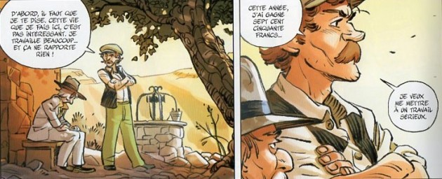 le château de ma mère) Stoffel et Scotto devaient se frotter au saint des saints de Marcel Pagnol : le diptyque des eaux des collines. Une fois de plus, le challenge est de taille car il s’agit d’un monument de la littérature autant que du cinéma français. Et une fois de plus le duo de scénariste réussi à conserver l’âme et l’esprit du roman. Ce premier album sert d’ouverture. Les personnages sont présentés ; même si l’éponyme, au centre de l’intrigue, n’apparait qu’au deux tiers de l’album. L’intrigue, justement, est également posée et il n’y a plus qu’à laisser tout cela s’échauffer au soleil de Provence.
