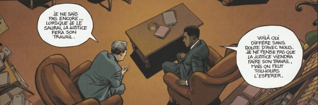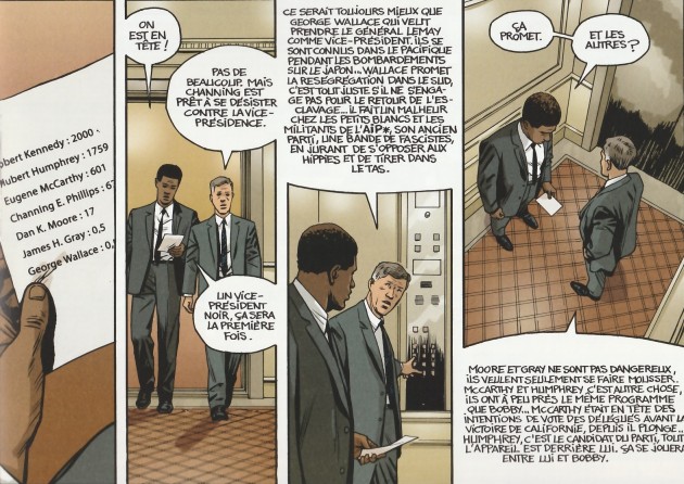 Kennedy pour enquêter. Ok, Jean Pierre Pécau évite tout de même meurtre ; celui de Bob Kennedy. Surnommé le Chevalier noir de Camelot, le cadet va se lancer dans la course à la Maison Blanche et dans une vendetta en mémoire de son frère. Pour cela, il va se servir d'un de ses gardes du corps. Link, véritable bras armé du sénateur, va remonter le fil des événements. À la manière d’Oliver Stone, il va interroger les témoins, les juges afin de comprendre. Mais cette enquête se fait aussi sur fond d'élection présidentielle et elles se font sous haute tension. Les allers-retours entre ces deux parties se font de manière très fluide. En revanche, les apparitions du machiavélique chef du FBI, J Edgar Hoover sont-elles beaucoup plus difficiles à comprendre puisqu'elles citent trop de personnages. Soit on replonge dans l'album précédent, soit on fait comme si elles n’existaient pas, leur rôle étant secondaire. En cette fin des années 60, le monde est un ébullition et cette violence est parfaitement montrée. Tout comme le rôle que va jouer le candidat Kennedy. Mais attention, pas de manichéisme : l'ambiguïté de Robert Kennedy est au centre de l’histoire ; lui qui prêche la fraternité mais