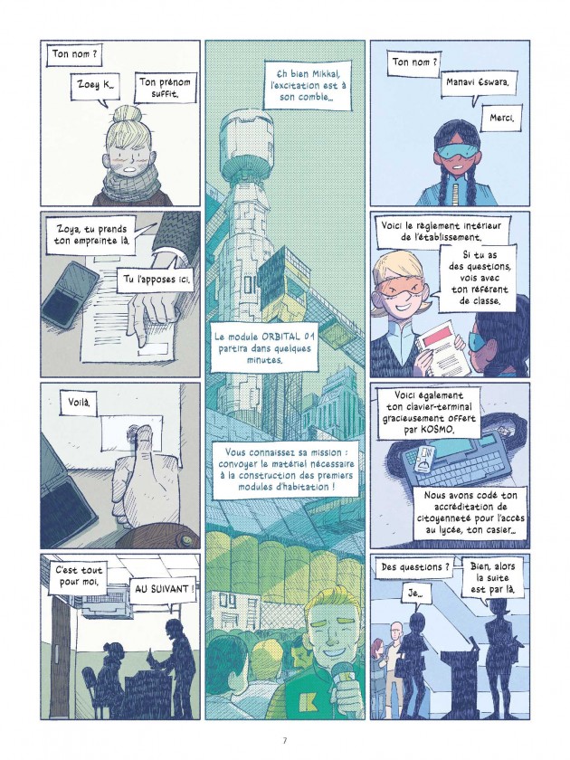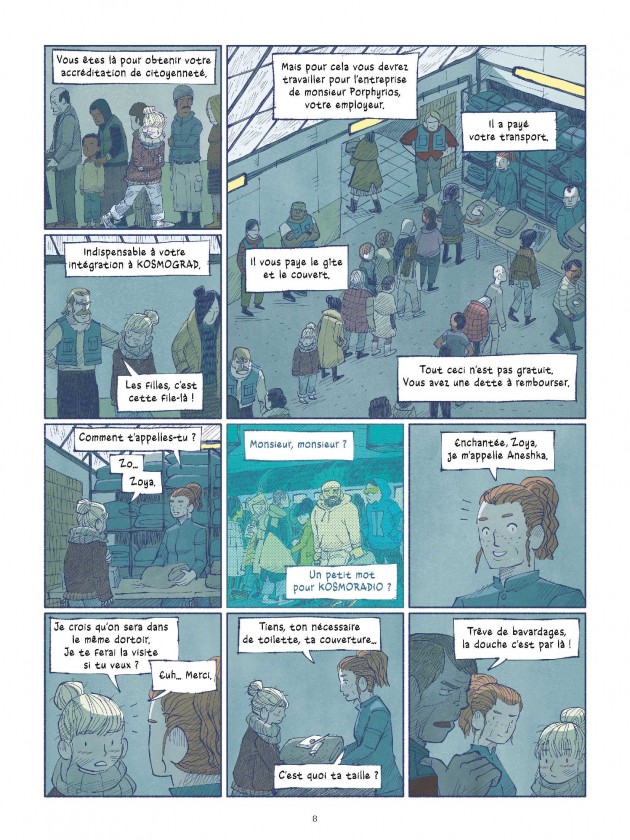 qui n'est pas sans rappeler la tournure que prend notre monde actuel. Monter des groupuscules racistes et extrémistes, disparités sociales, contrôle de la population et de son flux migratoire suite à divers bouleversements climatiques. Le récit est bien ficelé et l'intrigue rondement menée. Le dessin quant à lui reste fidèle au graphisme du tome précédent paru en février 2023. Ce premier tome d'une série annoncée comme un diptyque met en place l'univers. On y découvre la ville de Kosmograd et ses conditions de vie. Une entrée en matière qui pose les jalons d'un récit agréable à lire. Un récit de SF post-apocalyptique qui bien que sans révolutionner le genre propose des idées intéressantes faisant une relation avec notre propre société.