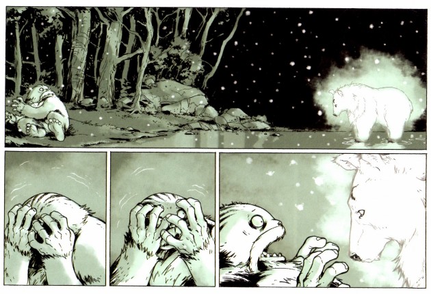 Découpé sous forme de strips d’une ou plusieurs pages, l’auteur nous propose de passer d’une scène à l’autre passant des préoccupations de Charles aux activités des habitants de la forêt sans forcement de logique entre elles si ce n’est le plaisir de partager le quotidien de ces animaux aux comportements humains. Le dessin de Karl Kerschl est charnu, réaliste et réussi à rester en parfaite adéquation avec la simplicité de ses histoires (ce n’est pas moi qui le dit, c’est Régis Loisel himself).