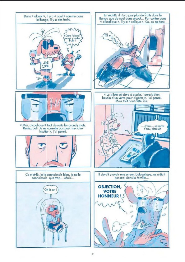 Le récit suit M. Terreur, un personnage à tête de chien évoluant dans un monde d’humains, figure marginale et immédiatement identifiable comme outsider. Comme les autres addicts croisés au fil du récit, il porte physiquement cette différence, presque comme une marque visible de son décalage avec le monde. Rien ici n’est lisse ou fonctionnel : M. Terreur est traversé par des failles anciennes, enracinées dans une enfance marquée par un père alcoolique et une instabilité affective durable.
