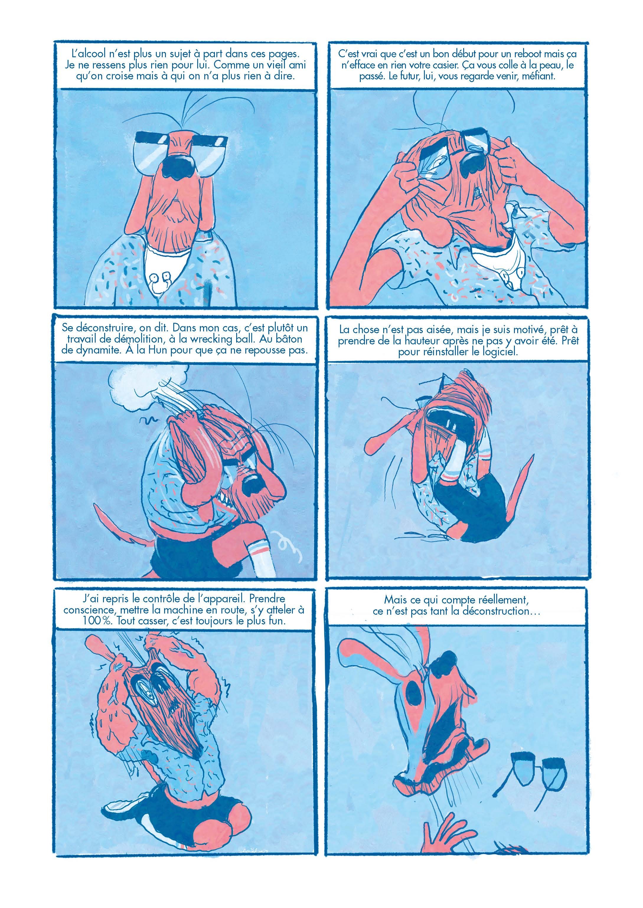 Le récit avance ainsi entre souvenirs, prises de consciences tardives et rechutes, dessinant un portrait sans fard de l’addiction comme processus global : une accumulation de manques, de silences et de détours, où l’on cherche à tenir debout sans jamais vraiment apprendre à se construire.