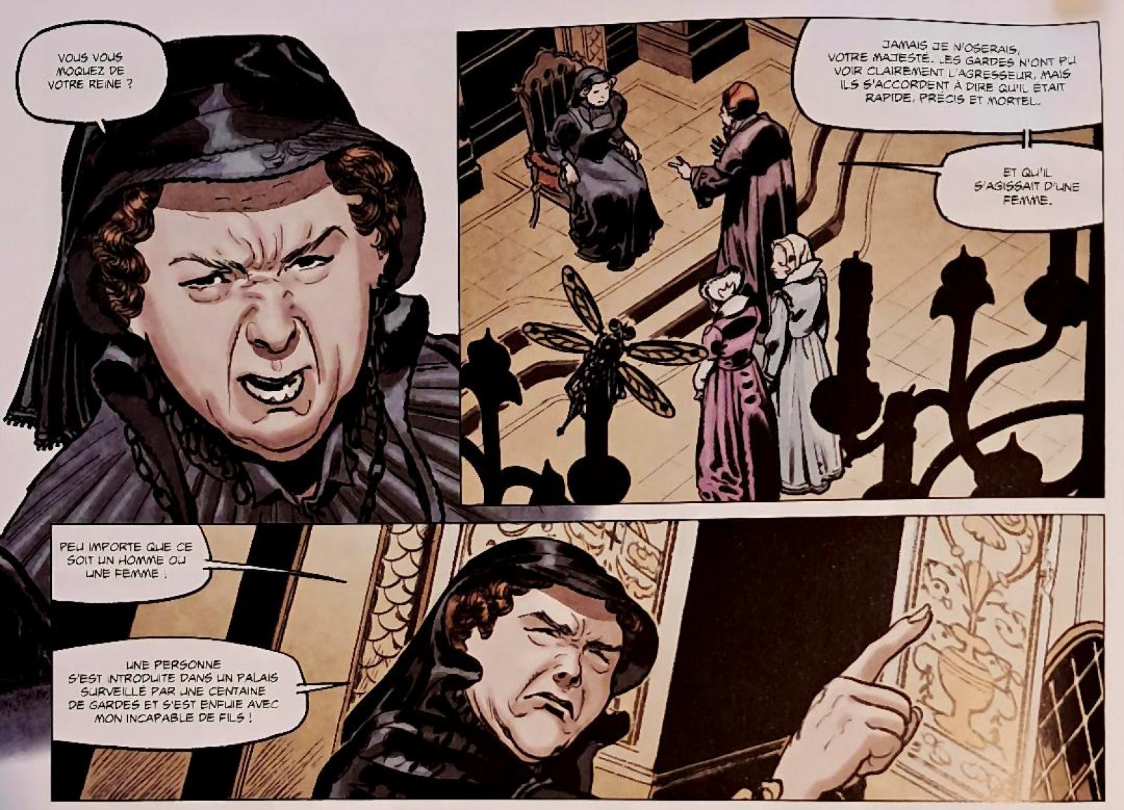 Ce que l’on nomme ici « escadron » est historiquement la Maison de Catherine de MÉDICIS avec ses nombreuses demoiselles d’honneur. Cette cour participait de la domestication de la noblesse, et les demoiselles pouvaient jouer le rôle de diplomates informelles sans pour autant abuser de leurs charmes pour recevoir confidences et secrets. On est donc bien loin de l’image d’espionnes séductrices et anachroniques présentées dans cette bande-dessinée. Et c’est le mythe porté par le roman La Reine Margot d’Alexandre DUMAS qui est repris par le scénariste RAULE en suivant la « légende noire » qui a toujours desservi Catherine de MÉDICIS. Par ailleurs, l’histoire est plaisante sans pour autant autoriser une pleine implication du lecteur dans le récit avec par exemple la présence d' un étrange automate volant reprenant une libellule, ou le peu crédible duel final se déroulant en haut de la tour Saint Jacques à Paris. Le dessin porte honorablement ce récit même s’il aurait été appréciable de retrouver davantage de détails dans les scènes intérieures comme extérieures. Cependant, il n’est pas valorisé par la couleur qui manque de nuances avec de simples aplats.