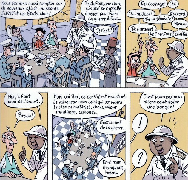 petits personnages. Avec cette série, nous suivons les périples de Lucien et de son grand-père. La mère du premier et fils du second est une aide-de-camp du général De Gaulle qui met la pression sur le chef de la France Libre afin que ses proches soient en sécurité. C’est ainsi qu’on avait laissé nos deux apprentis résistants à Brazzaville. Et c’est là qu’on les retrouve, mais de sécurité, il n’en est pas forcément question. Face aux poltrons, Lucien et Papi ne rêvent que d’héroïsme, de bravoure. C’est ainsi que, lorsque le gouverneur de Brazzaville évoque une nouvelle mission périlleuse, seul notre duo intergénérationnel se porte volontaire et le général est bien obligé d’accepter. Les voilà donc en partance pour Dakar, capitale de l’AOF. Une façon de nous apprendre que l’empire colonial français ne se retrouvait pas dans son ensemble derrière De Gaulle. Une fois sur place, Lucien et papi sont contraints de prendre des initiatives et des risques pour récupérer l’or de France et ainsi éviter qu’ils ne financent l’effort de guerre nazi. Amateurs de