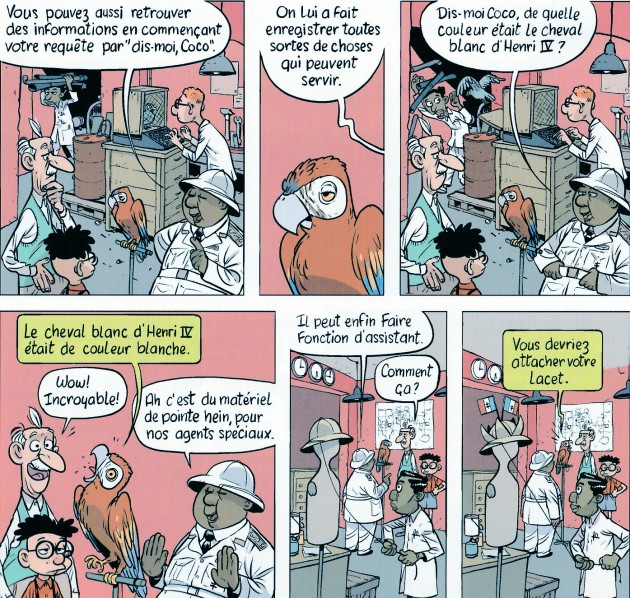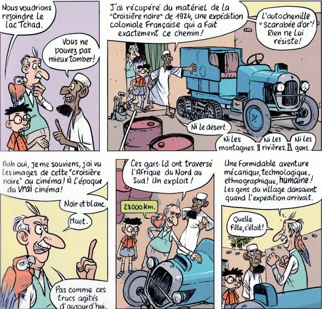 Morfalous, passez cependant votre chemin, point de fusillade et de sexe ici ! C’est un album familial, que diable ! Mais Fabrice Erre souhaite également ouvrir l’esprit des lecteurs et nos combattants vont troquer leur camion contre une autochenille Citroën, vestige de la croisière jaune. Ouverture historique et culturelle, mais aussi critique de notre société actuelle. Lucien et Papi vont devoir faire équipe avec Coco, un perroquet faisant fonction d’assistant. Malgré sa mémoire limitée, Coco enregistre des messages vocaux, assure la sécurité du véhicule et vous rappelle de faire vos lacets. Toute ressemblance avec