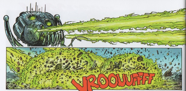 Le premier constat de ce triptyque est l’originalité de l’association du célèbre roman de HG Wells transposé en pleine première guerre mondiale. Cette idée originale ne peut nous mettre que l’eau à la bouche. Imaginez! Vous êtes au milieu de la première guerre mondiale, sur le front en train de survivre avec votre petit fusil et d’un coup, une invasion martienne débarque avec une technologie venue du futur, des armes inconnues jusqu’alors. Le décor est planté, les ennemis d’hier doivent s’associer (- Les humains seraient-ils devenus bons? -) et faire appel à des guests tel que Einstein, Flammarion ou bien encore le personnage de Conan Doyle. C’est ça la magie de la BD, donner vie à sa créativité et proposer une Science Fiction hors budget.