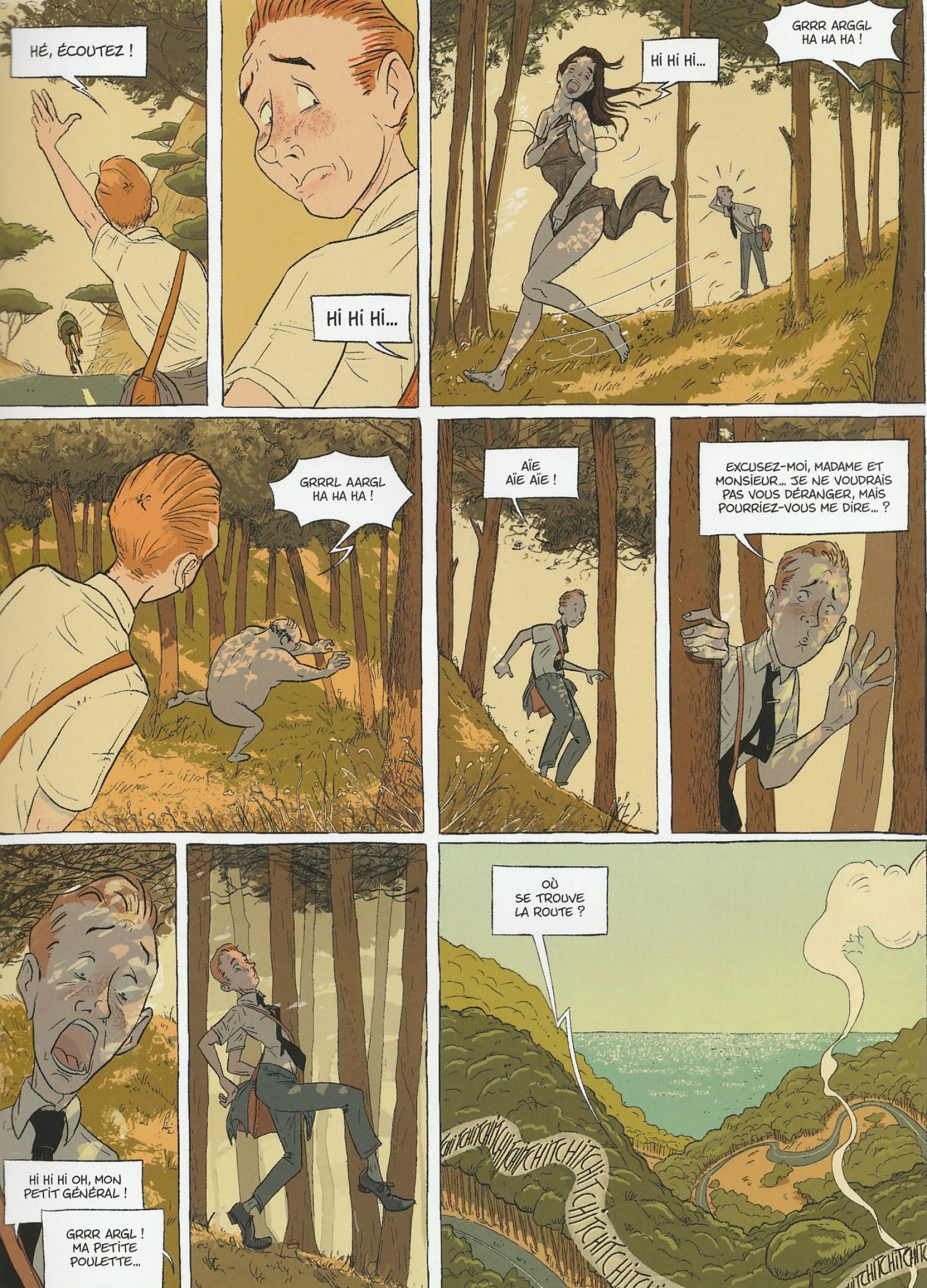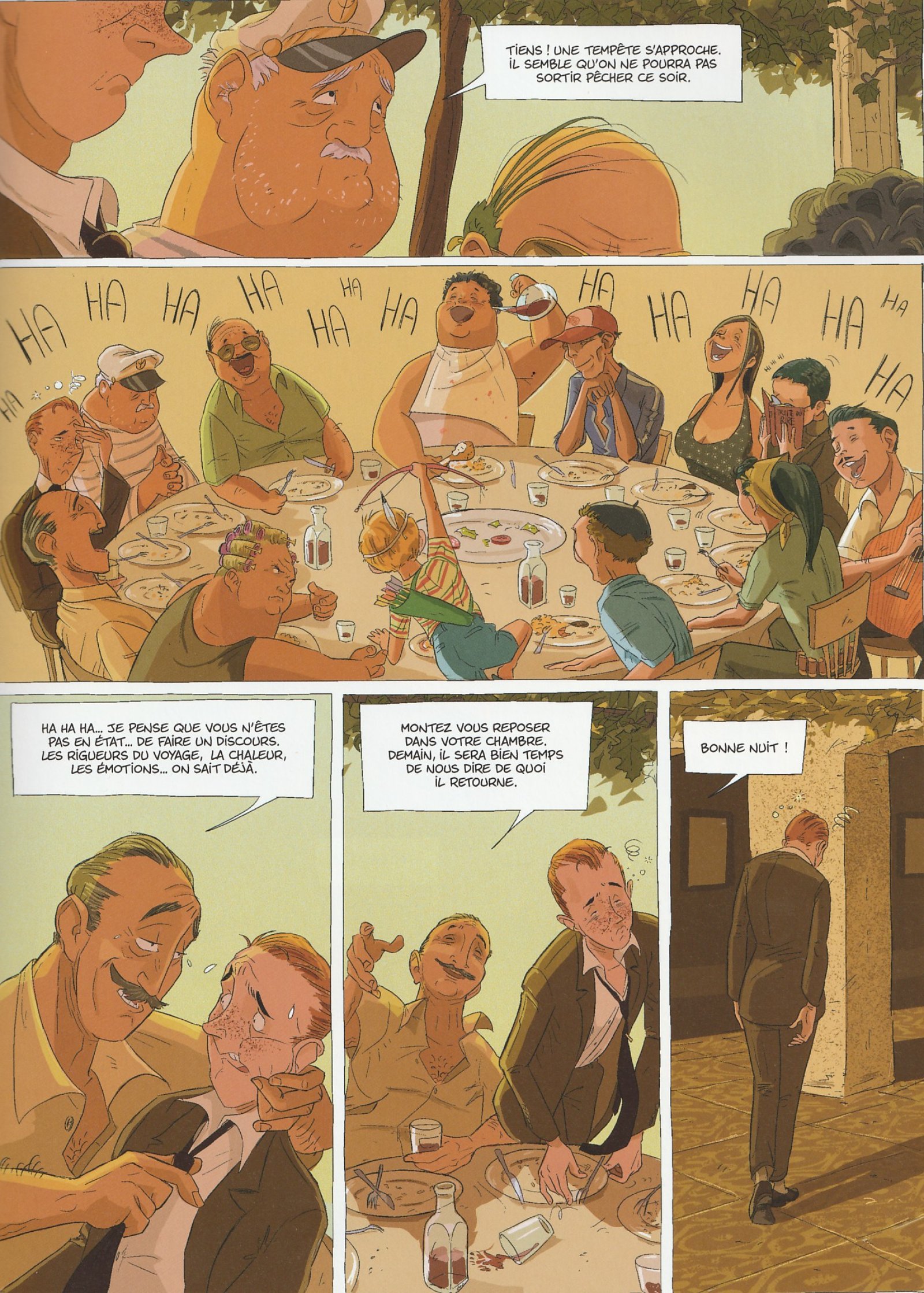Si, comme moi, le terme « Arcadie » ne vous évoque rien, tant mieux : vous pourrez savourer cette histoire en toute innocence. L’album s’ouvre d’ailleurs comme une comédie à la manière de Gérard Oury. Un jeune cadre ambitieux, très urbain, débarque dans un village méditerranéen avec la ferme intention de vendre le progrès. Mais rien ne se passe comme prévu : panne de voiture, détour improvisé à travers bois, galerie de personnages locaux hauts en couleur… Une fois arrivé au village, un quiproquo savoureux donne le véritable coup d’envoi de l’intrigue. Les terrains que convoite la multinationale appartiennent à une famille de « drôles » au sens le plus pittoresque du terme. Fidèle aux consignes de son directeur, Prométhée adopte la stratégie du « diviser pour mieux régner » et infiltre la pension familiale. Pourtant, quelque chose cloche. Le lecteur le sent instinctivement : une pièce du puzzle manque. On cherche, on s’interroge, on tente de deviner… en vain. Mon conseil : laissez-vous porter par le charme des rencontres et le rythme enlevé du récit. Le moment venu, Juanjo Rodriguez dévoilera la clé. Certes, certaines ellipses , notamment dans le dernier quart de l’album, se révèlent un peu abruptes et nuisent légèrement à la lisibilité de la psychologie des personnages et de l’intrigue. Rien toutefois de rédhibitoire : il suffit de se laisser emporter par le dessin semi-réaliste de Juanjo Rodriguez. Les décors offrent un dépaysement total, somptueux mélange de Dolce Vita et de rythmes andalous. Les personnages, délicieusement exubérants, dégagent une impression de déjà-vu qui les rend immédiatement attachants. La mise en page privilégie de petites vignettes dynamiques qui insufflent une grande vitalité aux dialogues, tout en laissant place à de larges cases maîtrisées lorsque l’émotion l’exige. La colorisation, baignée de teintes dorées et jaunâtres, fait du soleil un personnage à part entière. Quant au casting final, il apporte les ultimes éclaircissements avec efficacité.